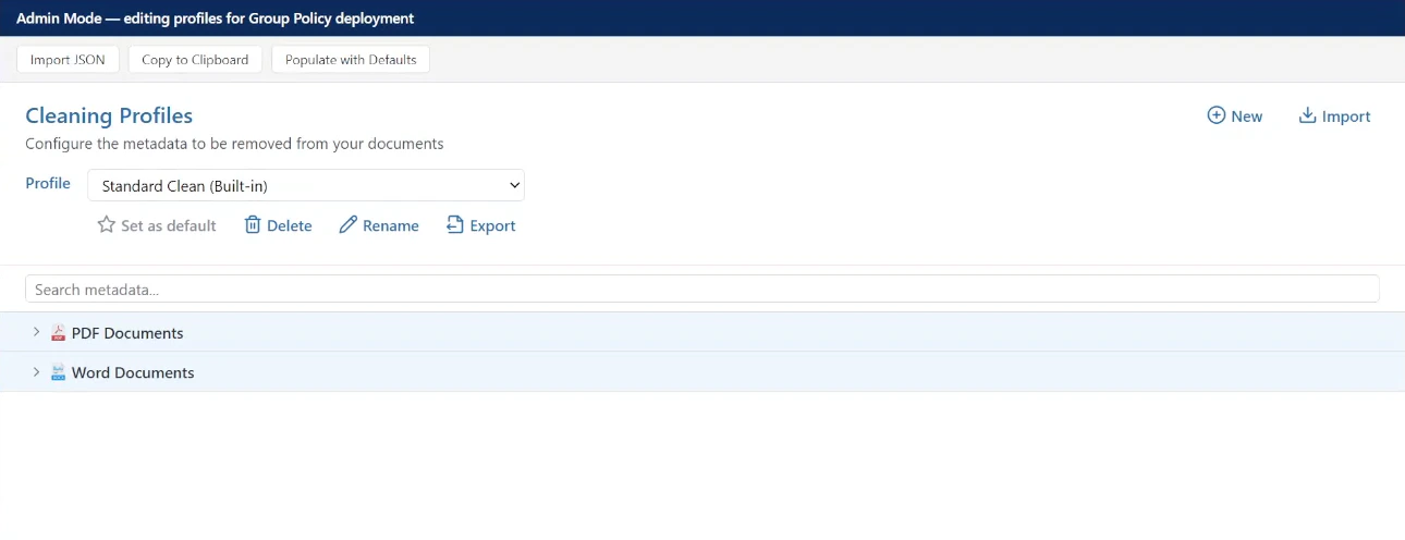 The Configure admin cleaning profiles setting is a User Configuration policy that allows administrators to define cleaning profiles centrally. These profiles are deployed to users and cannot be edited by them. The policy value is a JSON string representing the profile collection. To create or update admin cleaning profiles, administrators typically need to edit this JSON string directly. Workflow for updating admin profiles:- Copy the existing profile collection JSON string from Group Policy