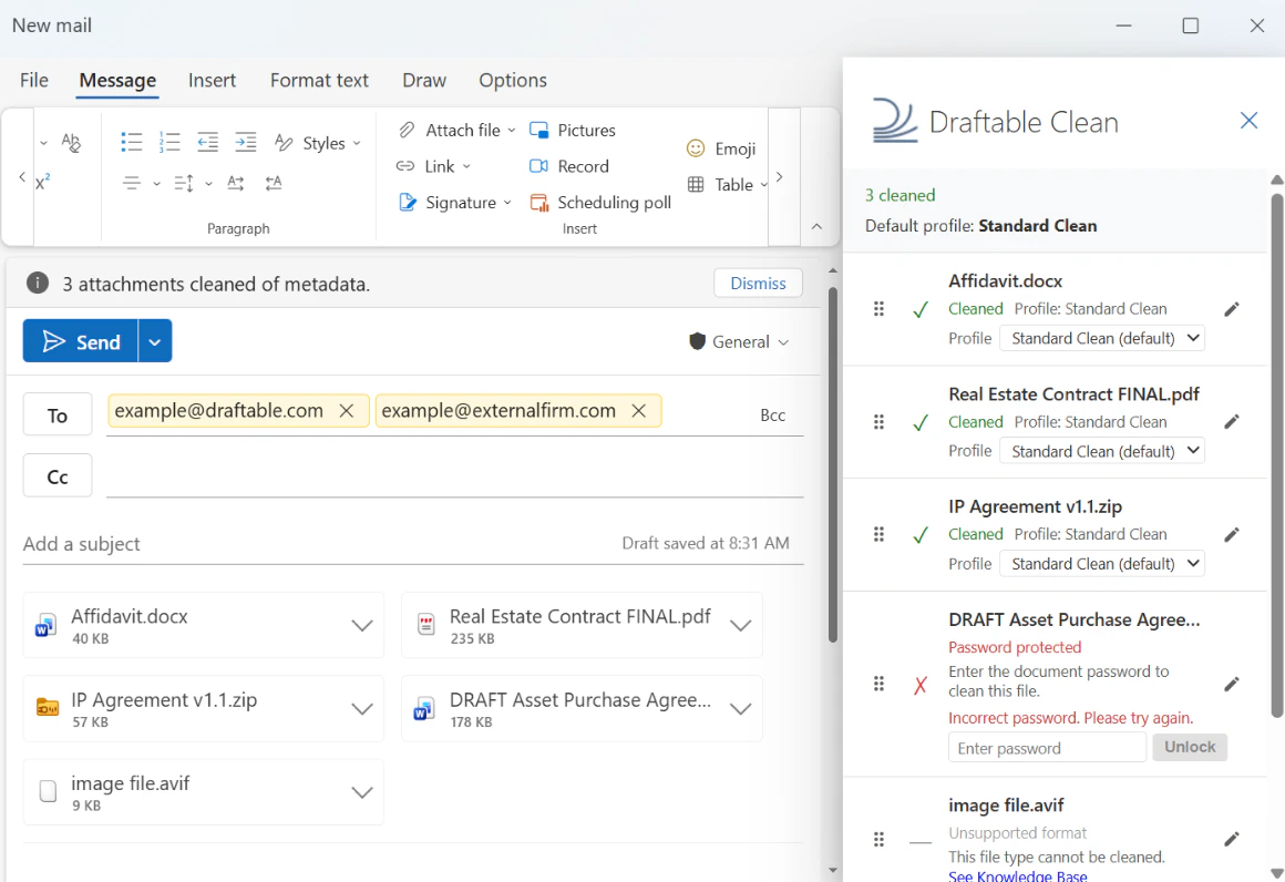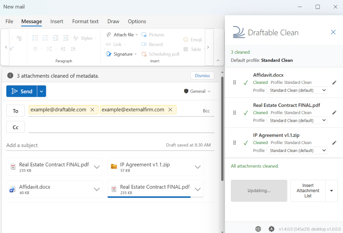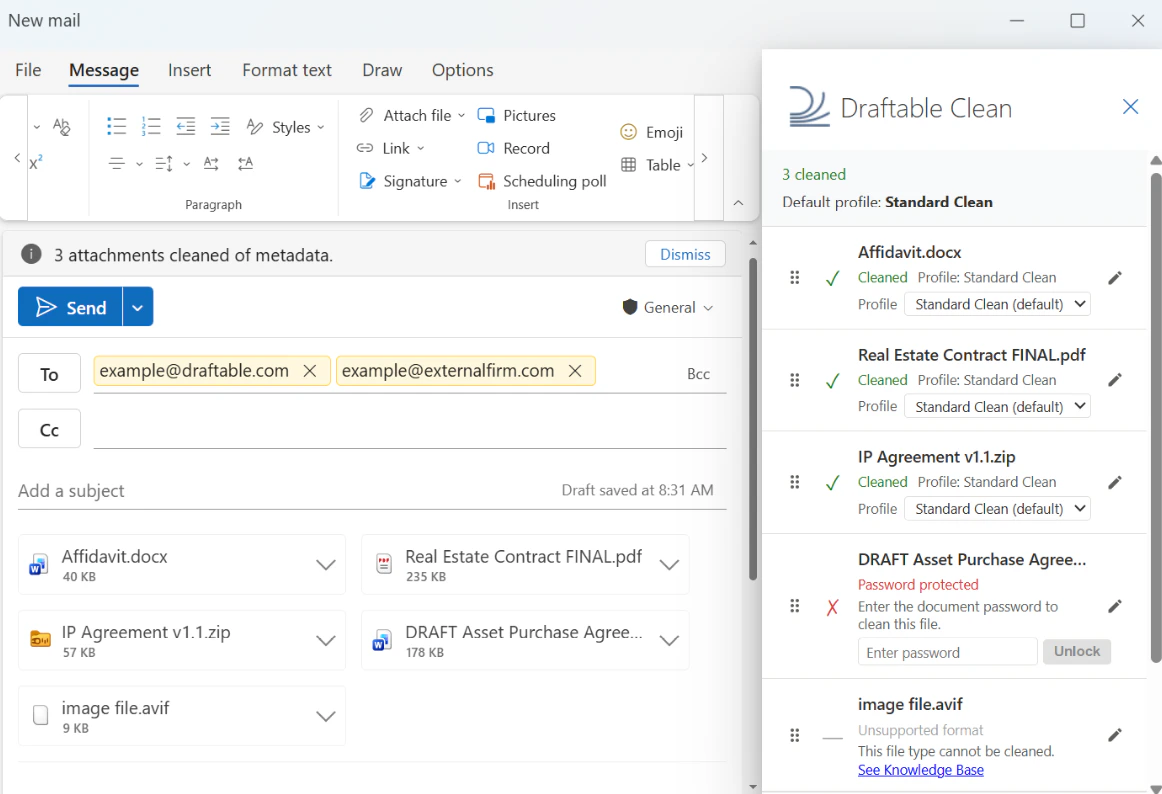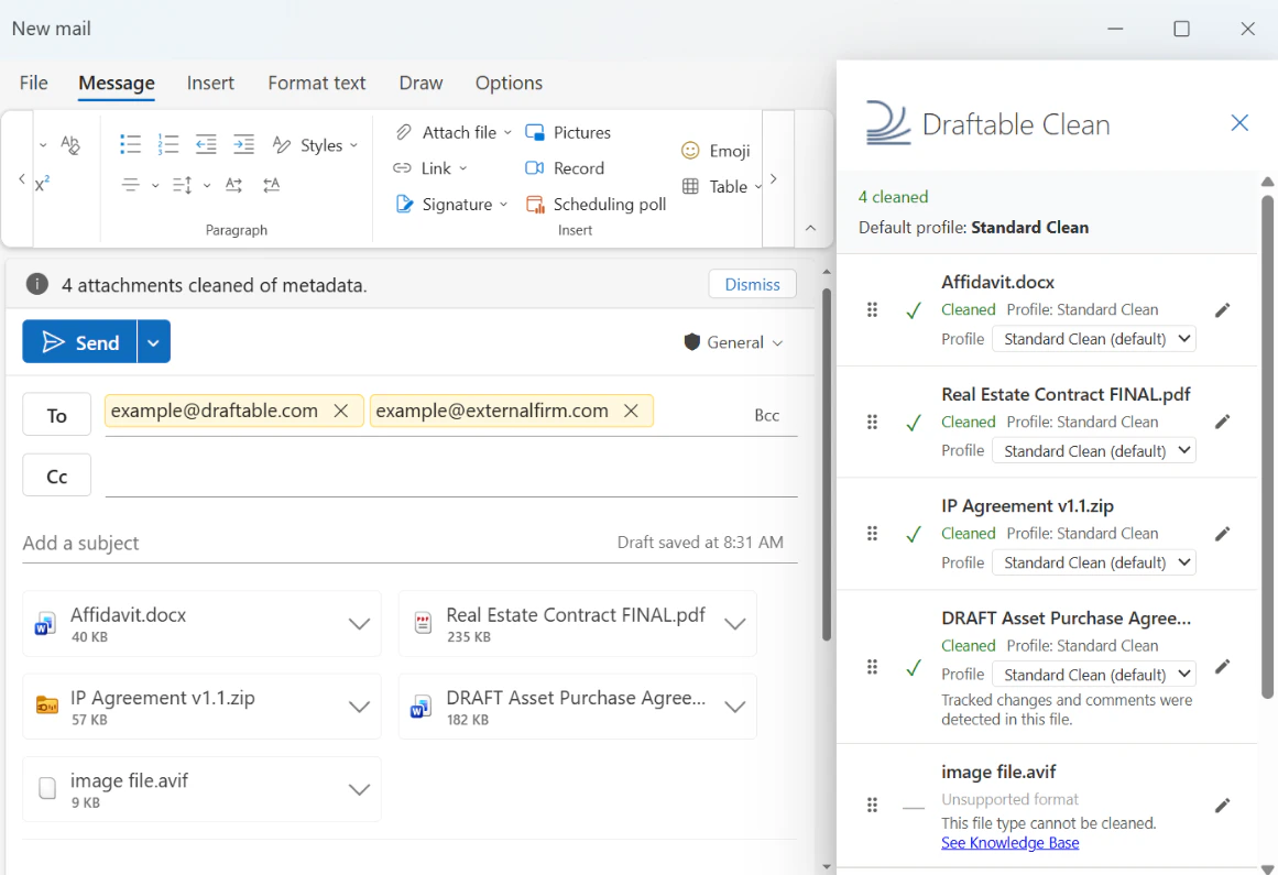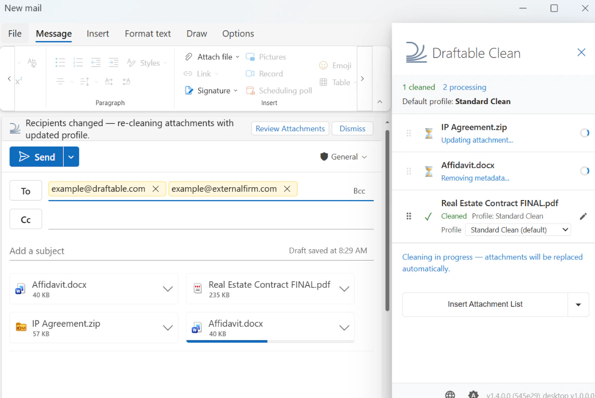 - Draftable Clean detects the attachments and cleans them automatically using the appropriate profile based on recipient domains
