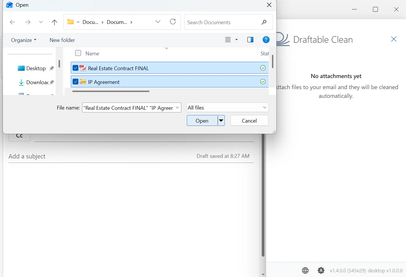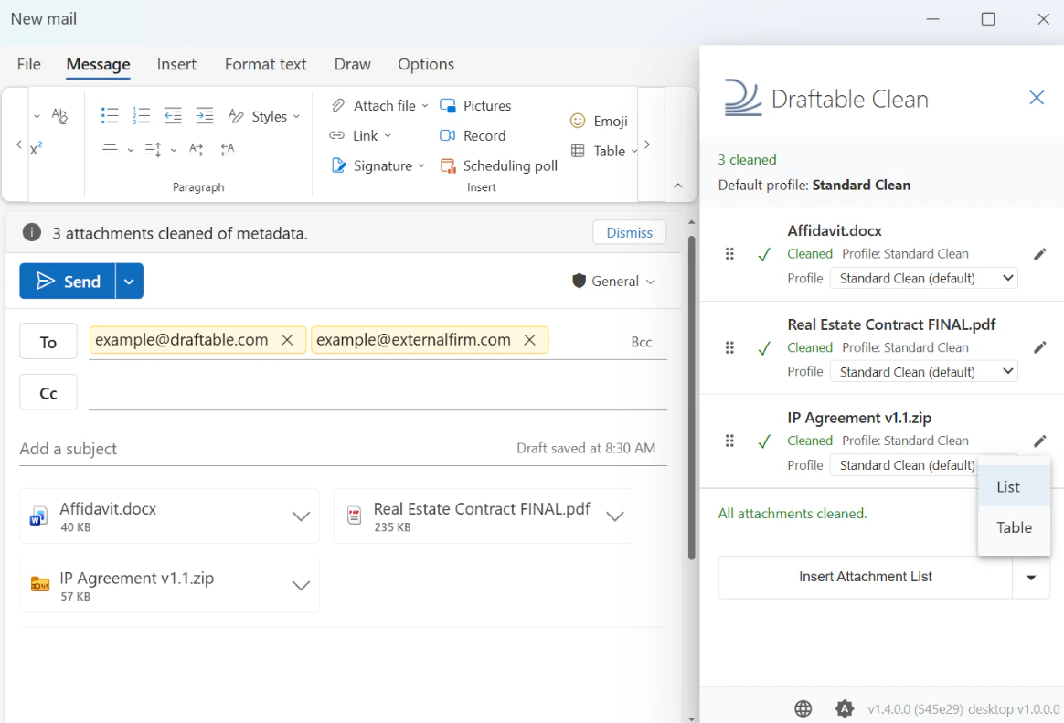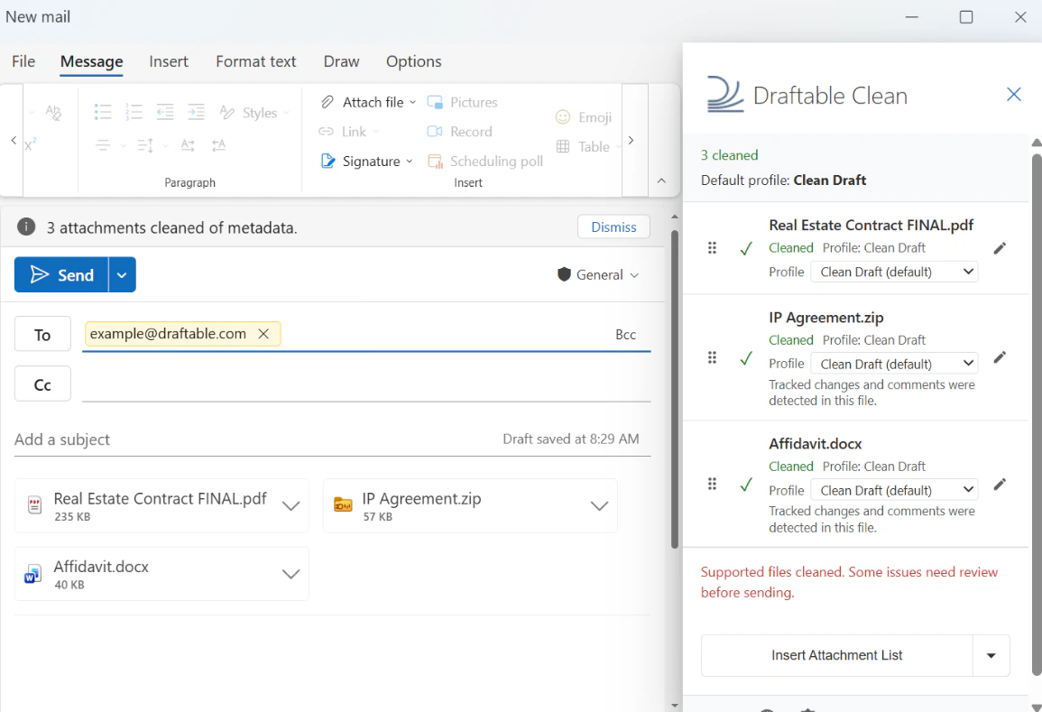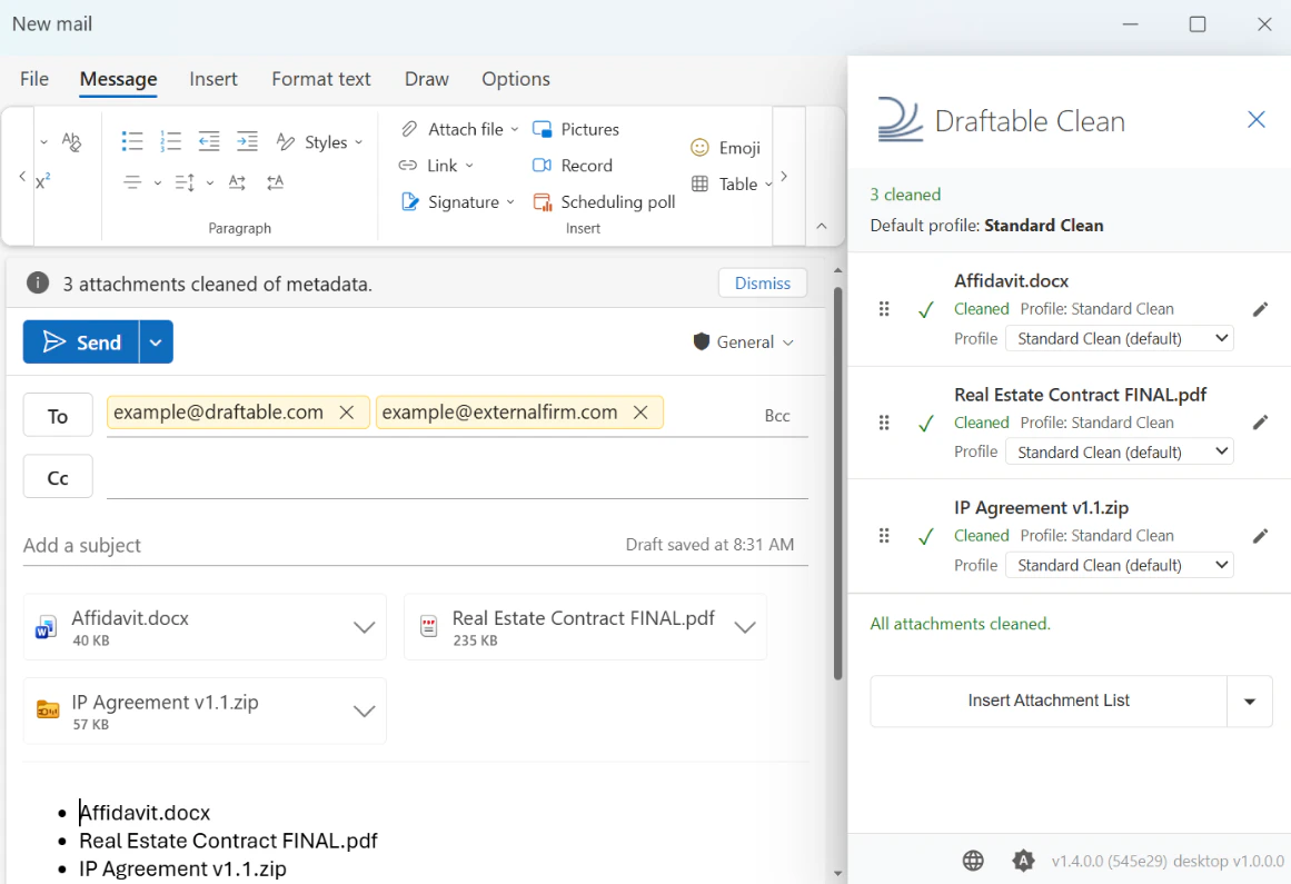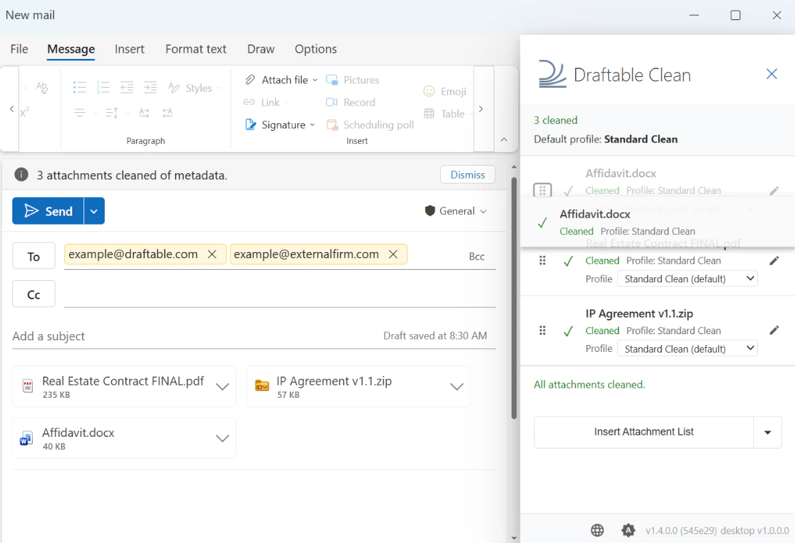 - Draftable Clean detects the attachments and cleans them automatically using the appropriate profile based on recipient domains