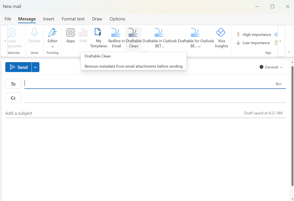 Open a new email in Outlook and click Draftable Clean in the ribbon. A tooltip confirms: “Remove metadata from email attachments before sending.”