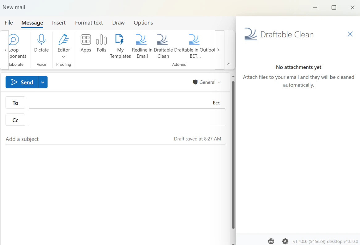 The Draftable Clean add-in is a panel that runs directly inside Microsoft Outlook. It automatically cleans attachments as you compose emails. The desktop application must be running for the add-in to function — if it is not already open, the add-in will attempt to launch it silently in the background.Setting up the Outlook add-in