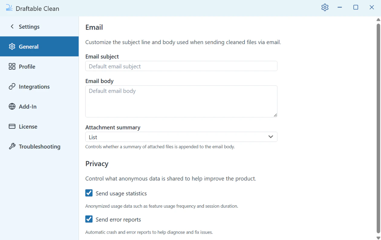 - Email subject — The default subject line for emails sent from Draftable Clean