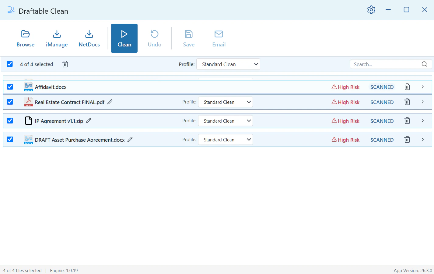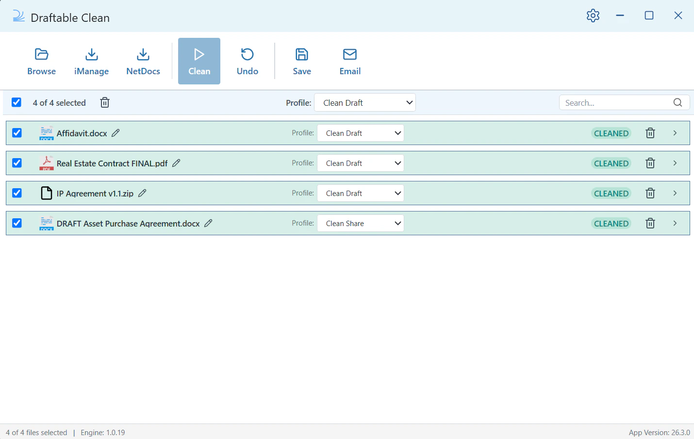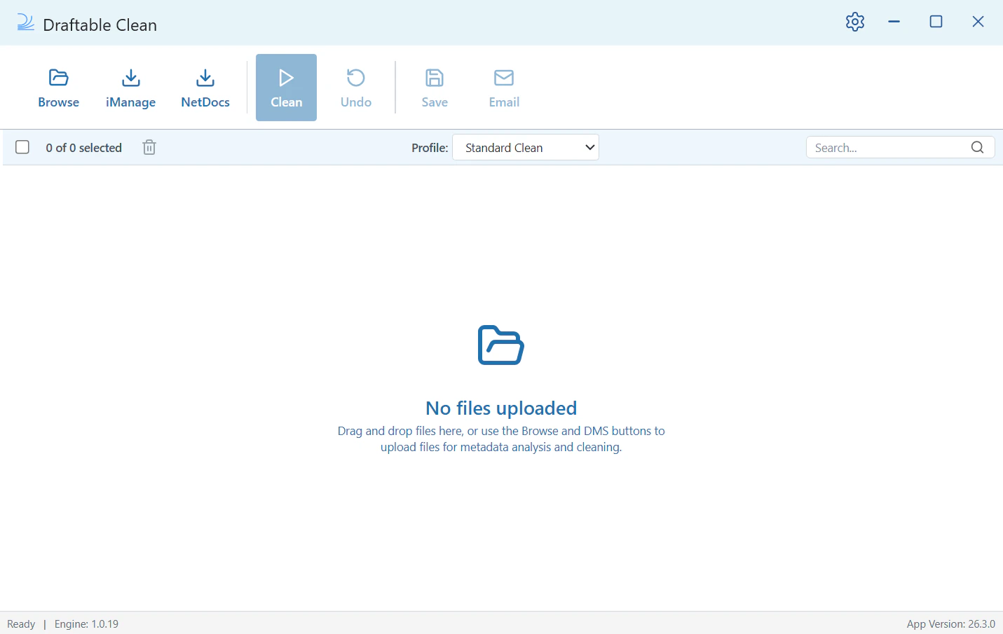 Open Draftable Clean. You’ll see the main application window with the toolbar across the top: Browse, iManage, NetDocs, Clean, Undo, Save, and Email.