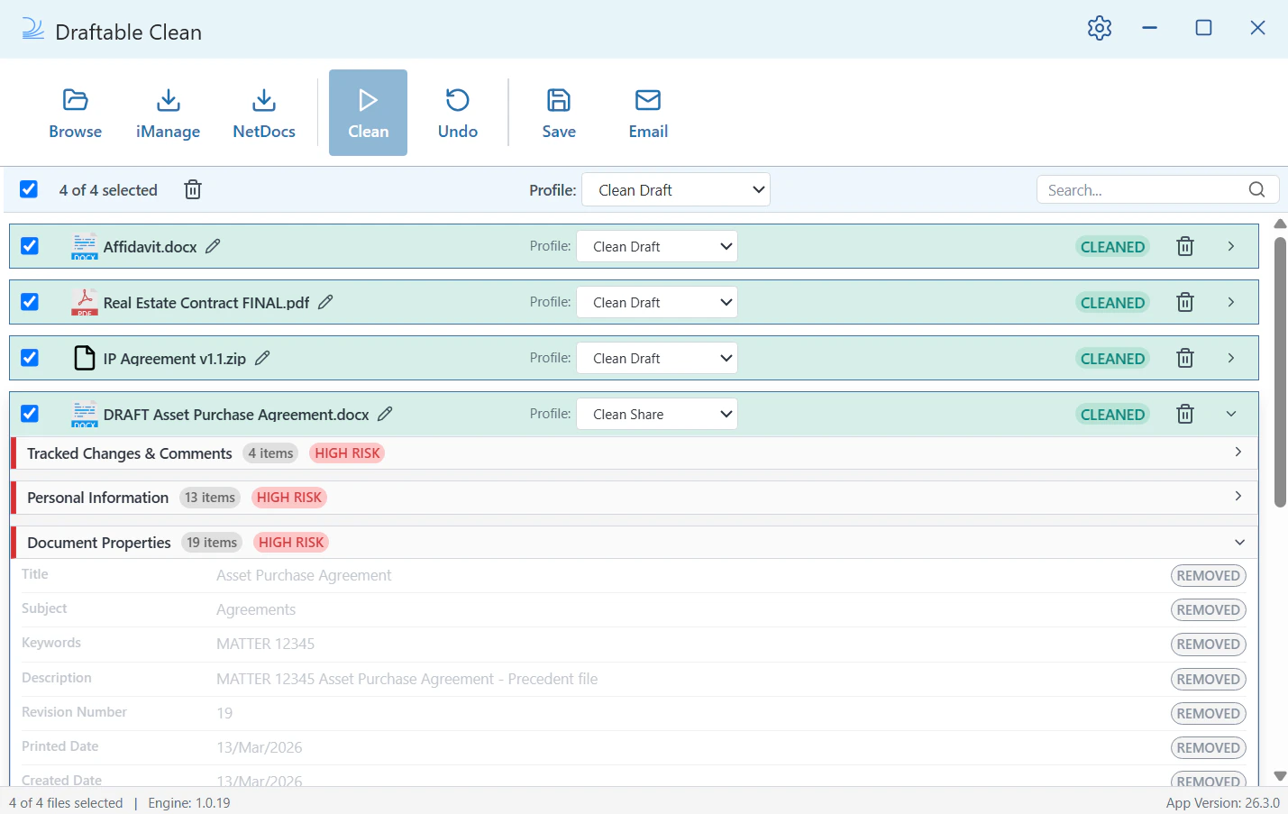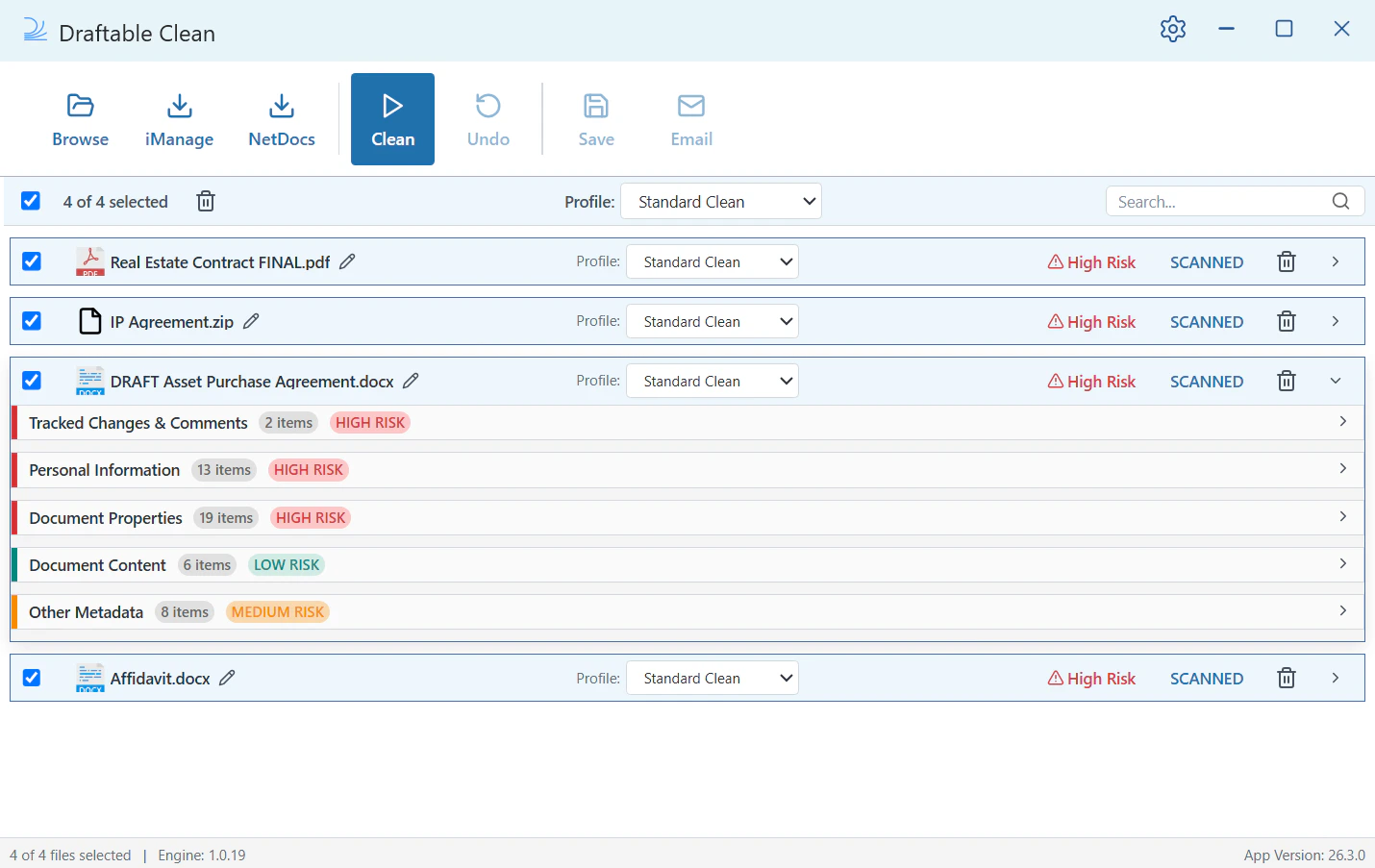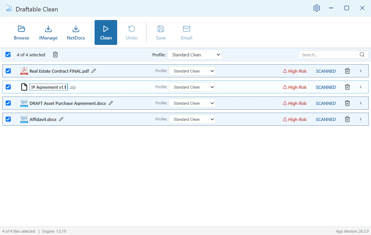 Open Draftable Clean. You’ll see the main application window with the toolbar across the top: Browse, iManage, NetDocs, Clean, Undo, Save, and Email.
