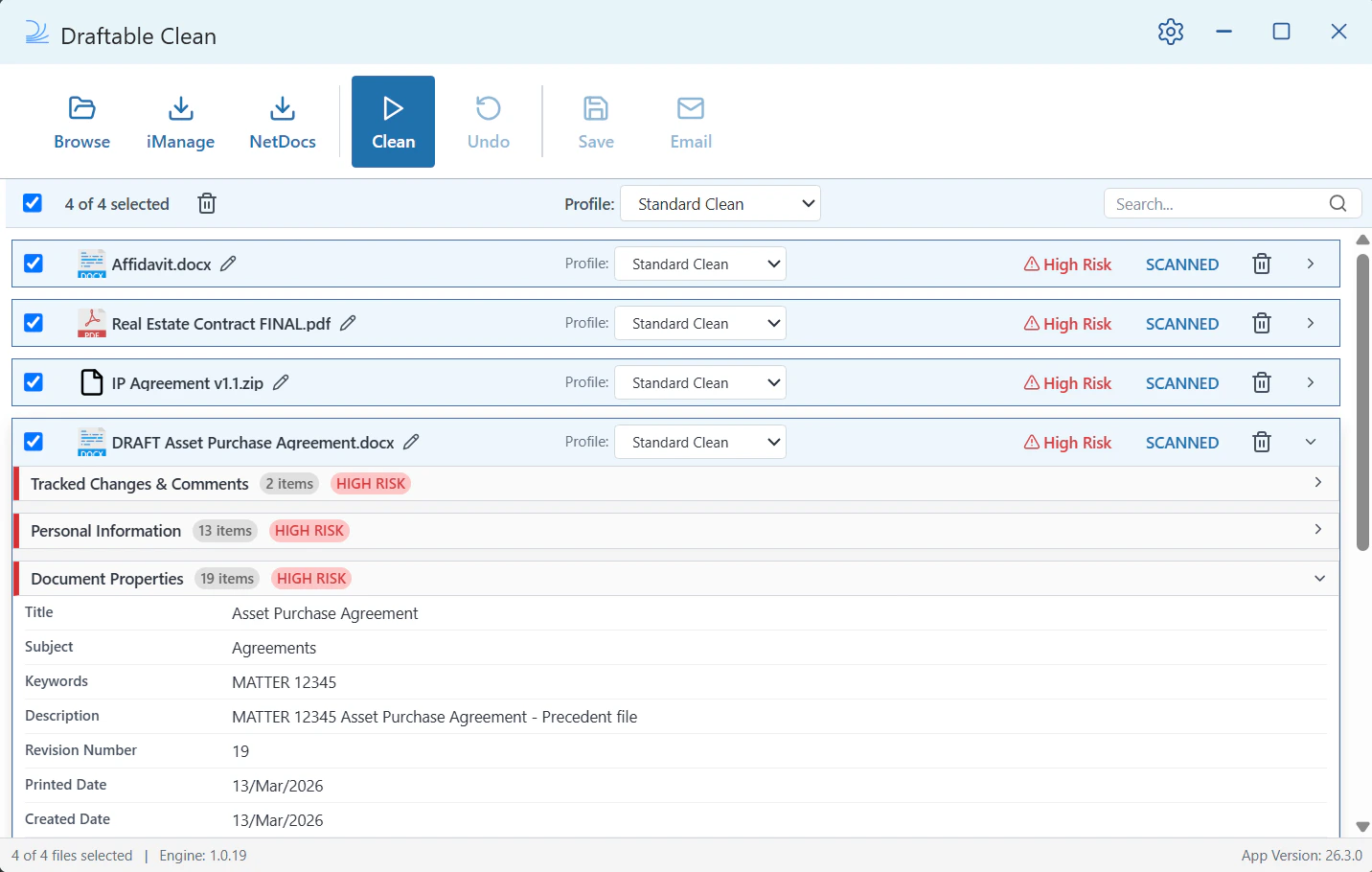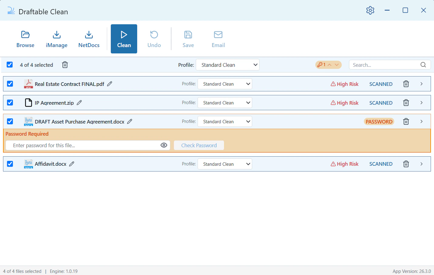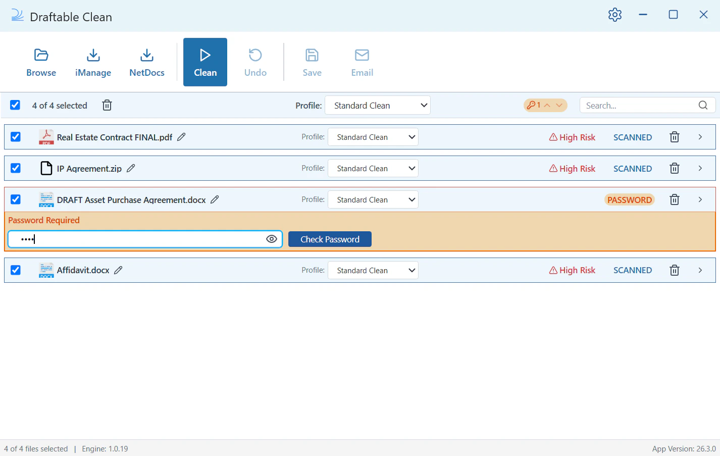 Your files appear in the file list. Each file is automatically scanned and assigned an overall risk rating (e.g. High Risk) with a SCANNED status. This tells you Draftable Clean has identified metadata that should be reviewed or cleaned.If a file shows a PASSWORD status (highlighted in orange), it is password-protected and cannot be scanned until you provide the password. A Password Required prompt appears automatically below the file with a password field.