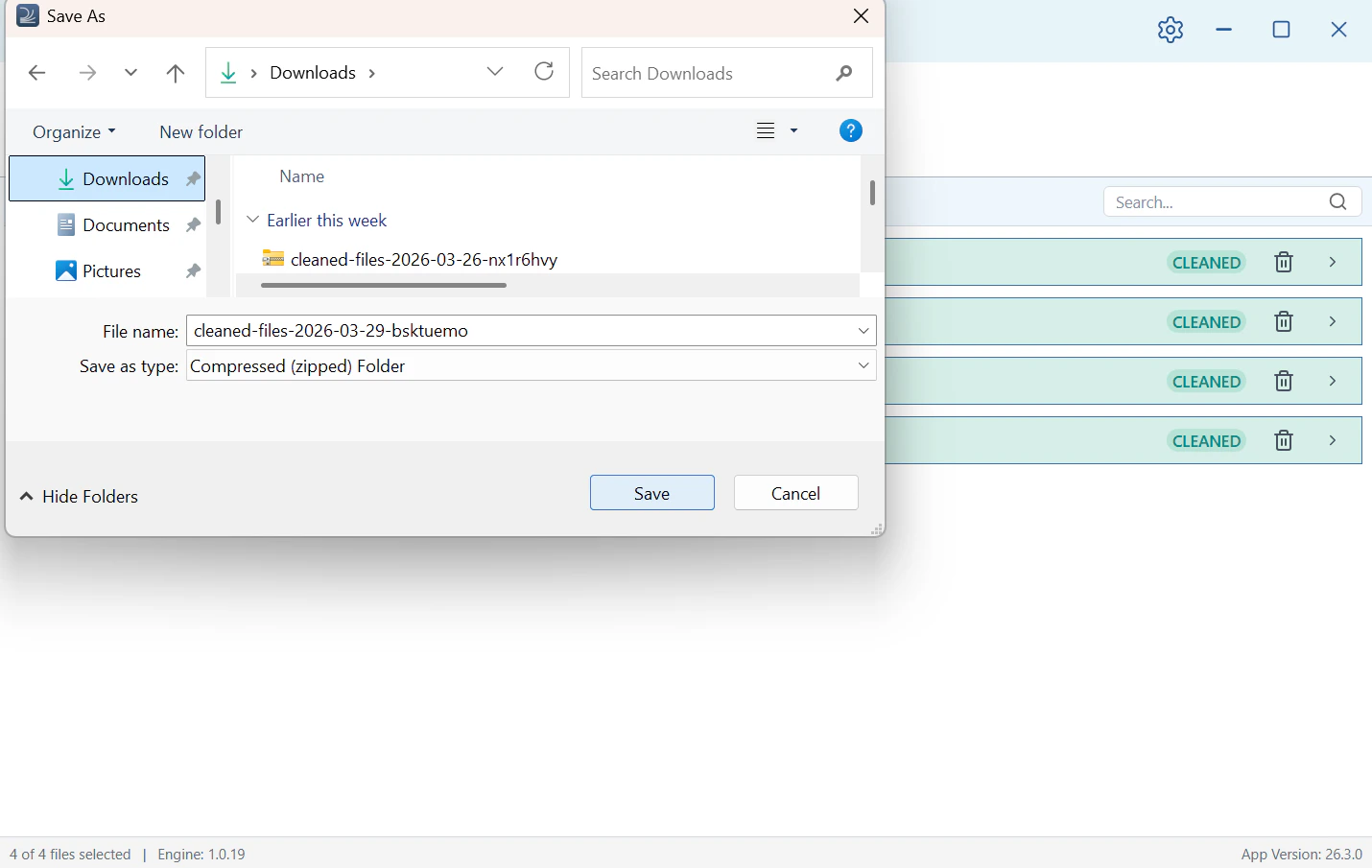 Once your files are cleaned, you can save them locally or share them via email. Save — Click Save in the toolbar to save your cleaned files. Draftable Clean packages them into a compressed ZIP folder with a timestamped filename.