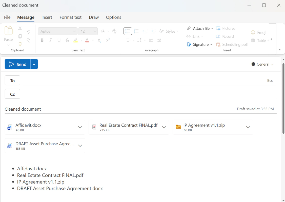| Draftable Clean Outlook add-in | Right-hand panel inside Outlook that automatically cleans attachments as you compose emails | Cleaning documents as part of your email sending workflow |