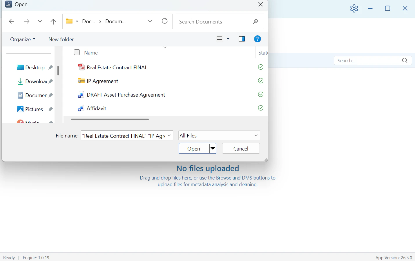 Click Browse to open a file browser, then select one or more documents from your local folders. You can also drag and drop files directly into the application window. To upload files from your DMS, click iManage or NetDocs in the toolbar.