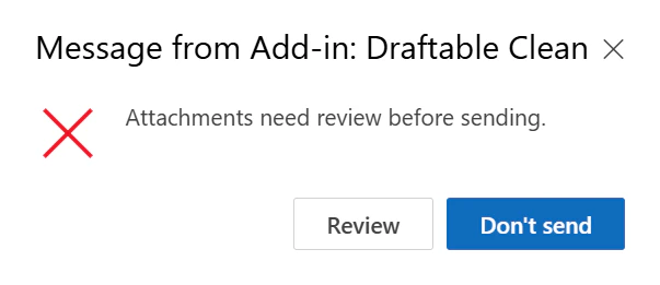 Draftable Clean controls what happens when issues are detected on send. By default:- Attachments not finished cleaning — Sending is blocked with a dialog: “Attachments need review before sending.” The user can click Review to return to the email or Don’t send to cancel.