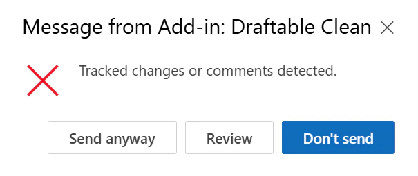 - Tracked changes or comments detected — The user is prompted with a dialog: “Tracked changes or comments detected.” The user can click Send anyway, Review, or Don’t send.