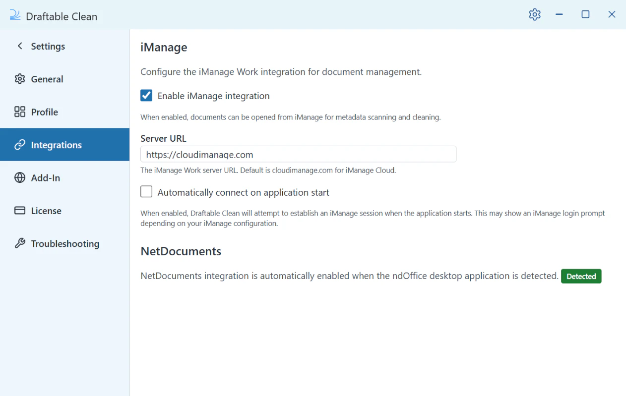 NetDocuments integration is automatically enabled when the ndOffice desktop application is detected on your machine. If Draftable Clean shows NetDocs as unavailable:- Verify that ndOffice is installed and running.