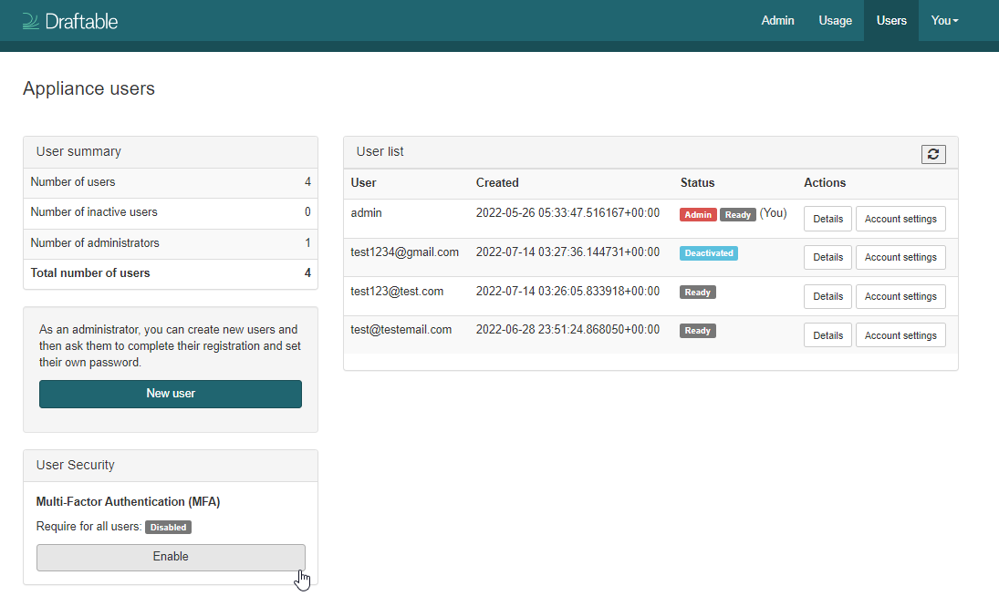 As an administrator account, navigate to the Users tab and see the User Security window in the bottom left. You can click on enable to immediately require all users to use MFA to login with their account.