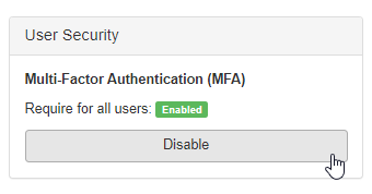You can remove MFA from all users by returning to the users page within the admin section, and by clicking disable in the User Security window. This will immediately remove MFA requirements for login, for all user accounts.