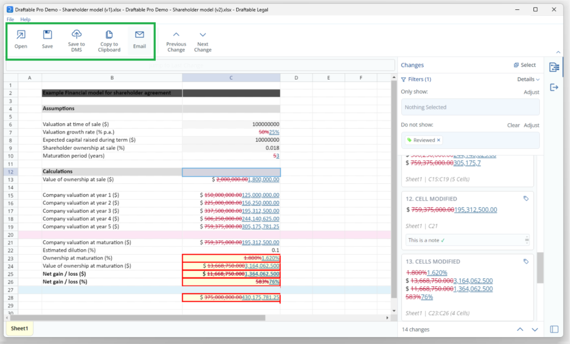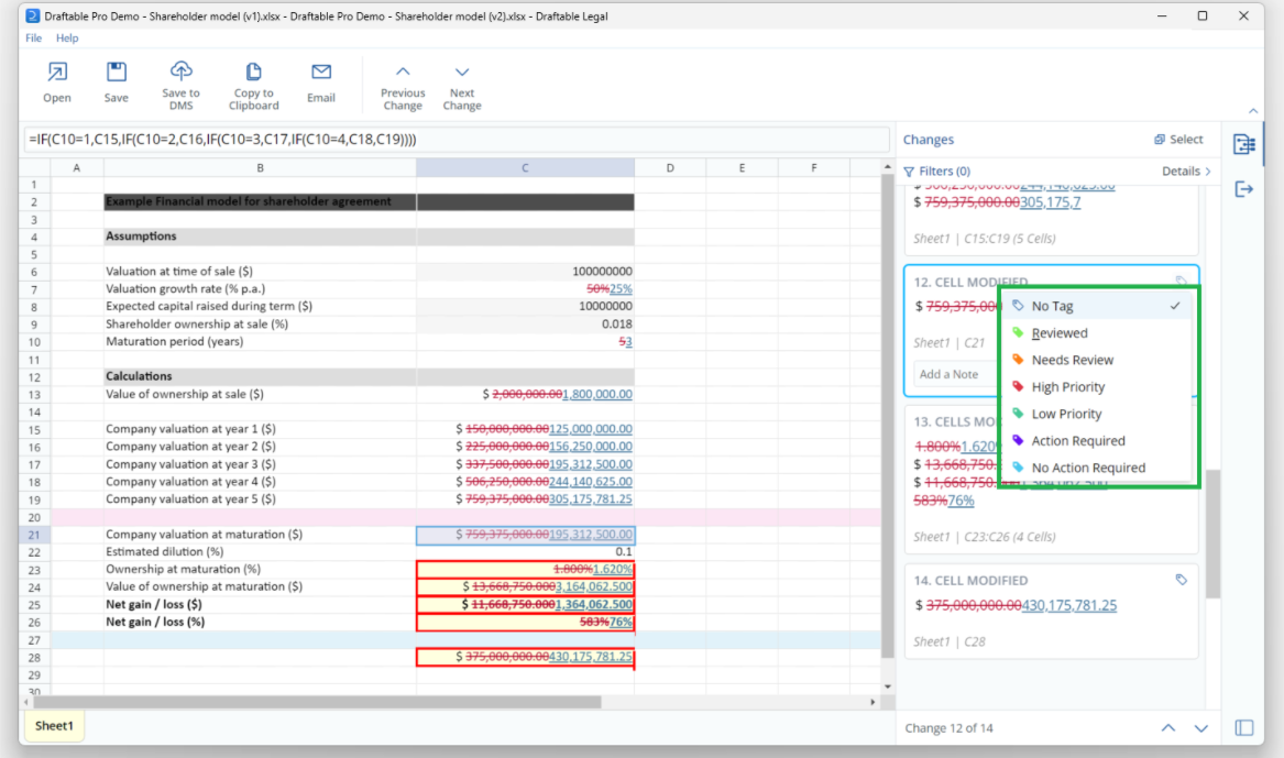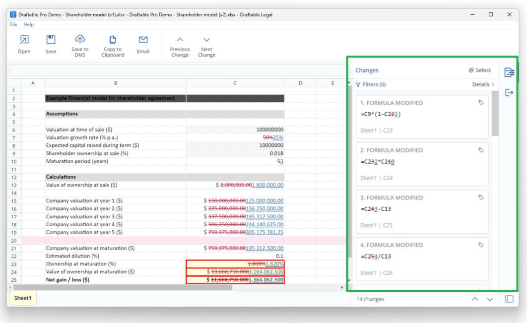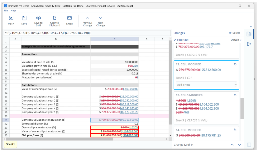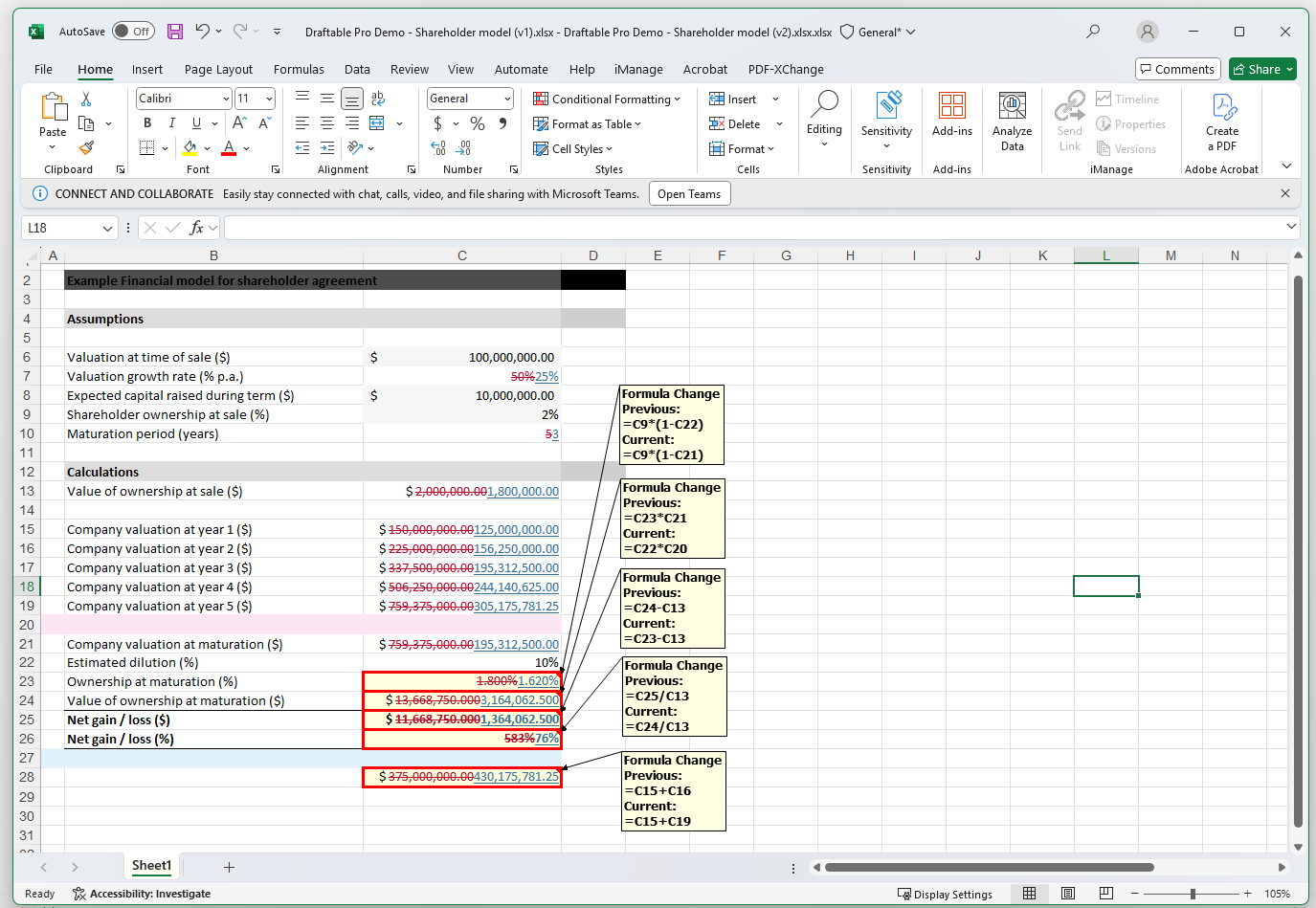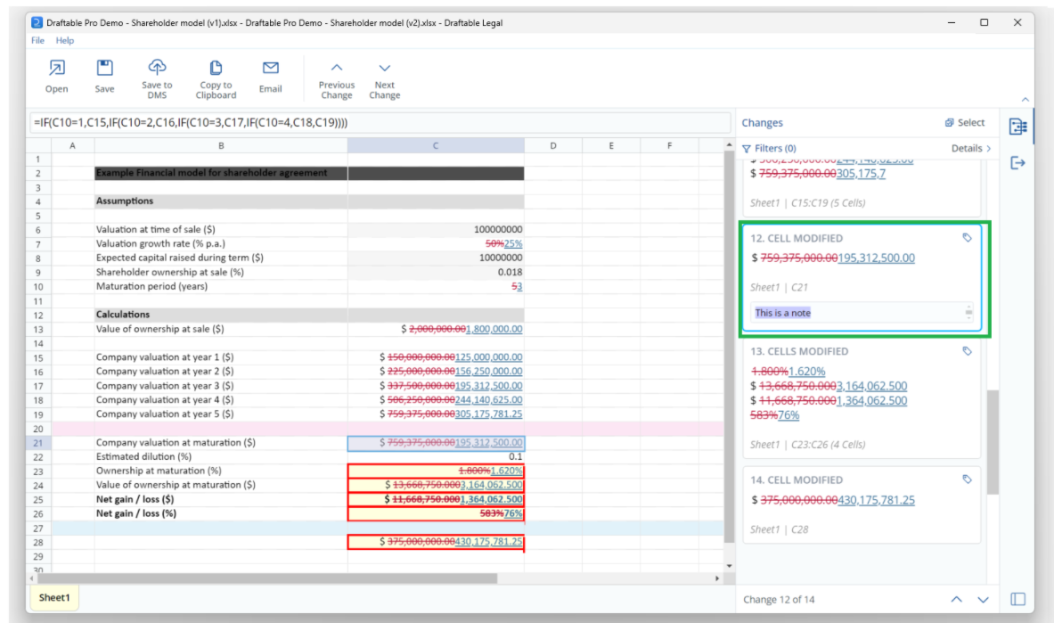 All changes are shown as Redline, where deletions and insertions are shown per cell, and formula changes are shown as comments with the cell highlighted