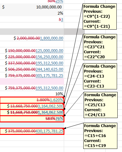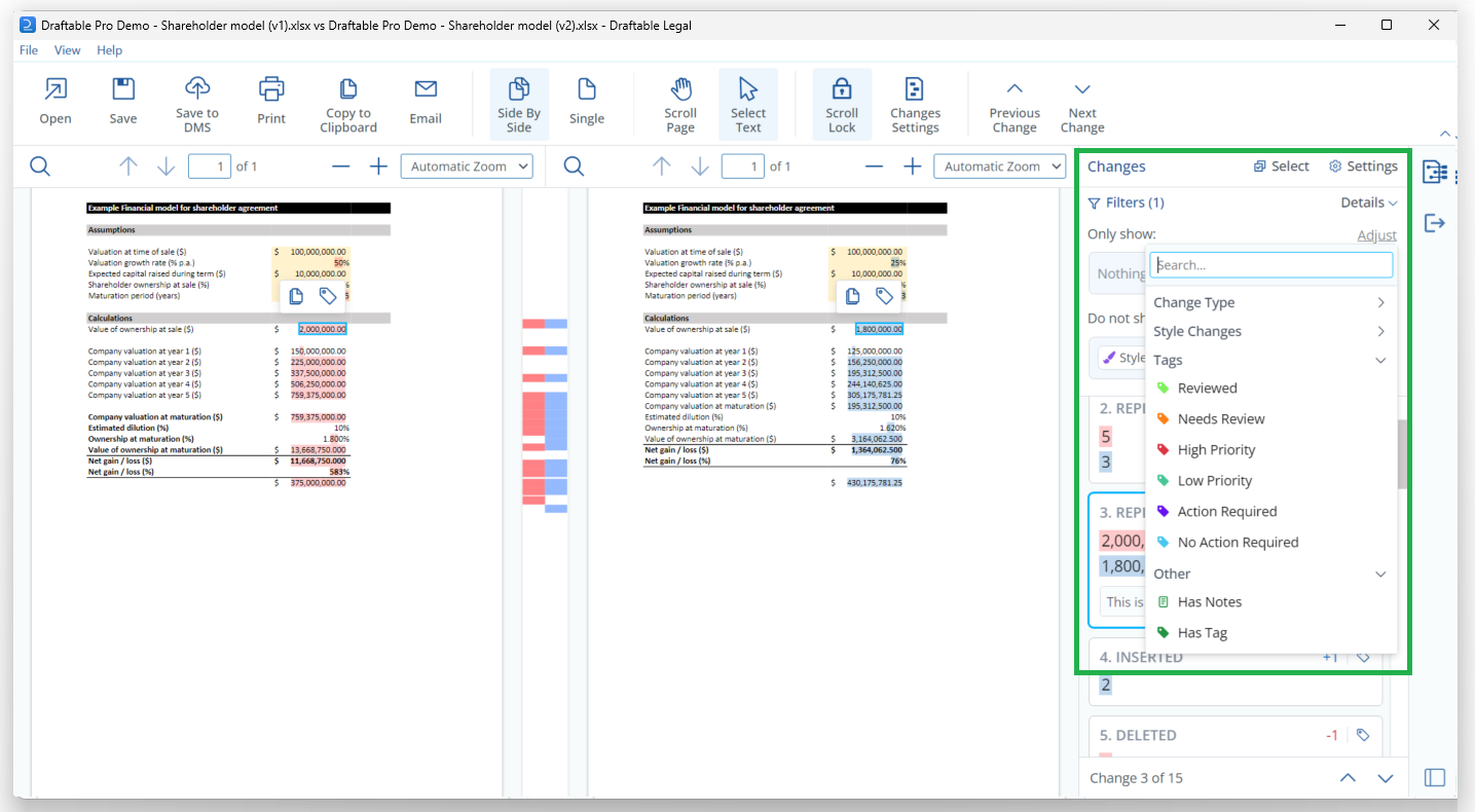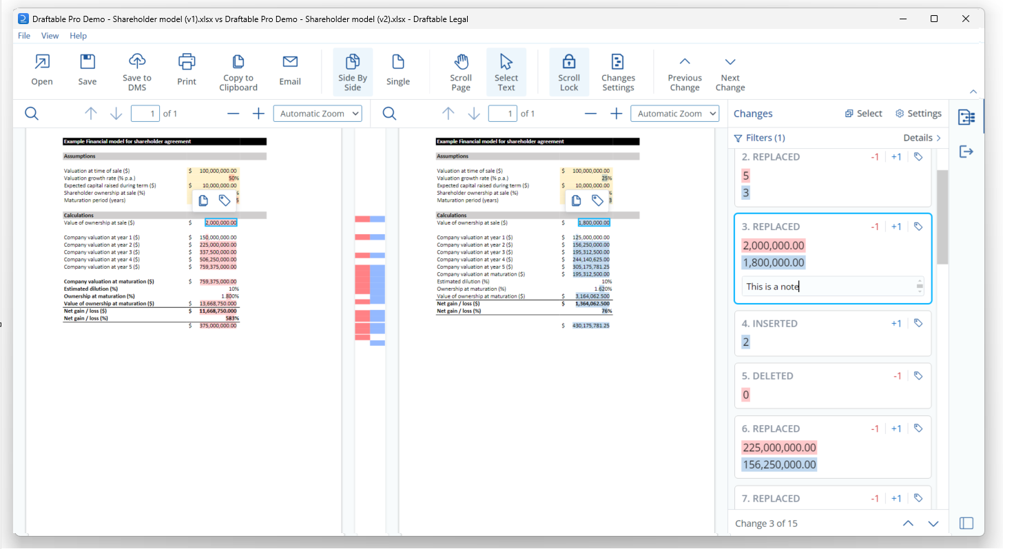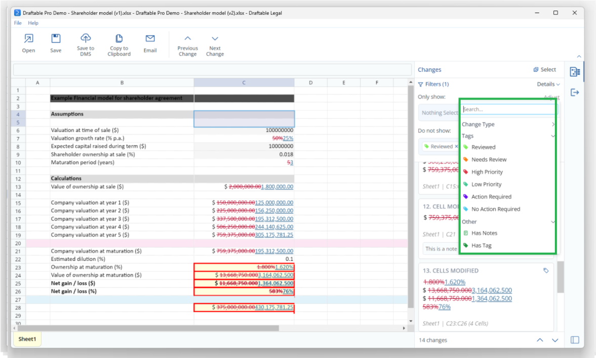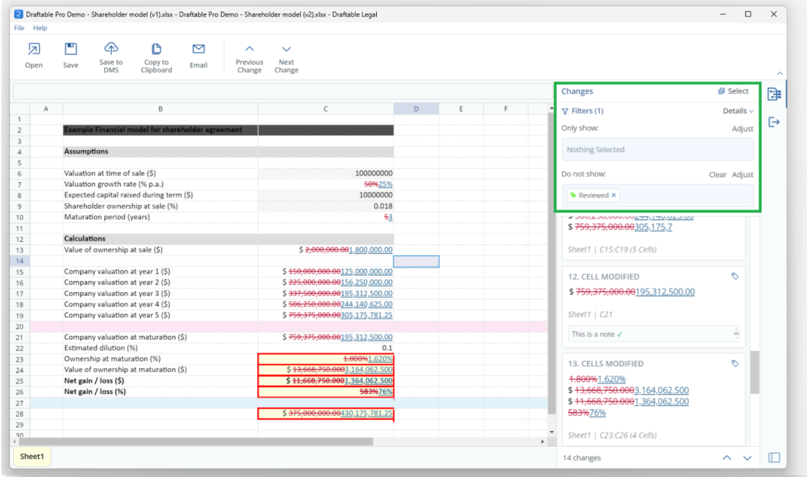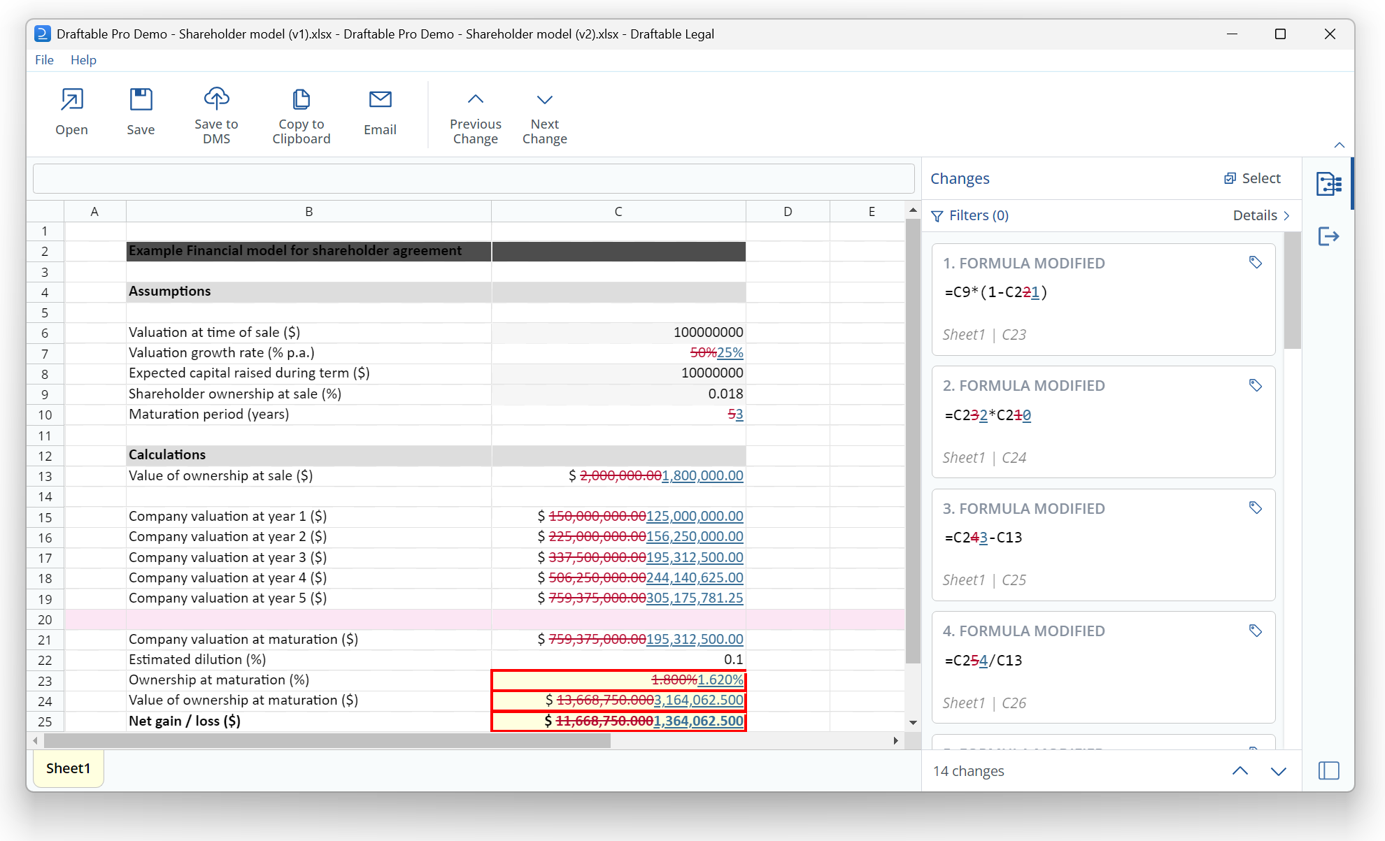 All changes are shown as Redline, where deletions and insertions are shown per cell, and formula changes are shown as comments with the cell highlighted