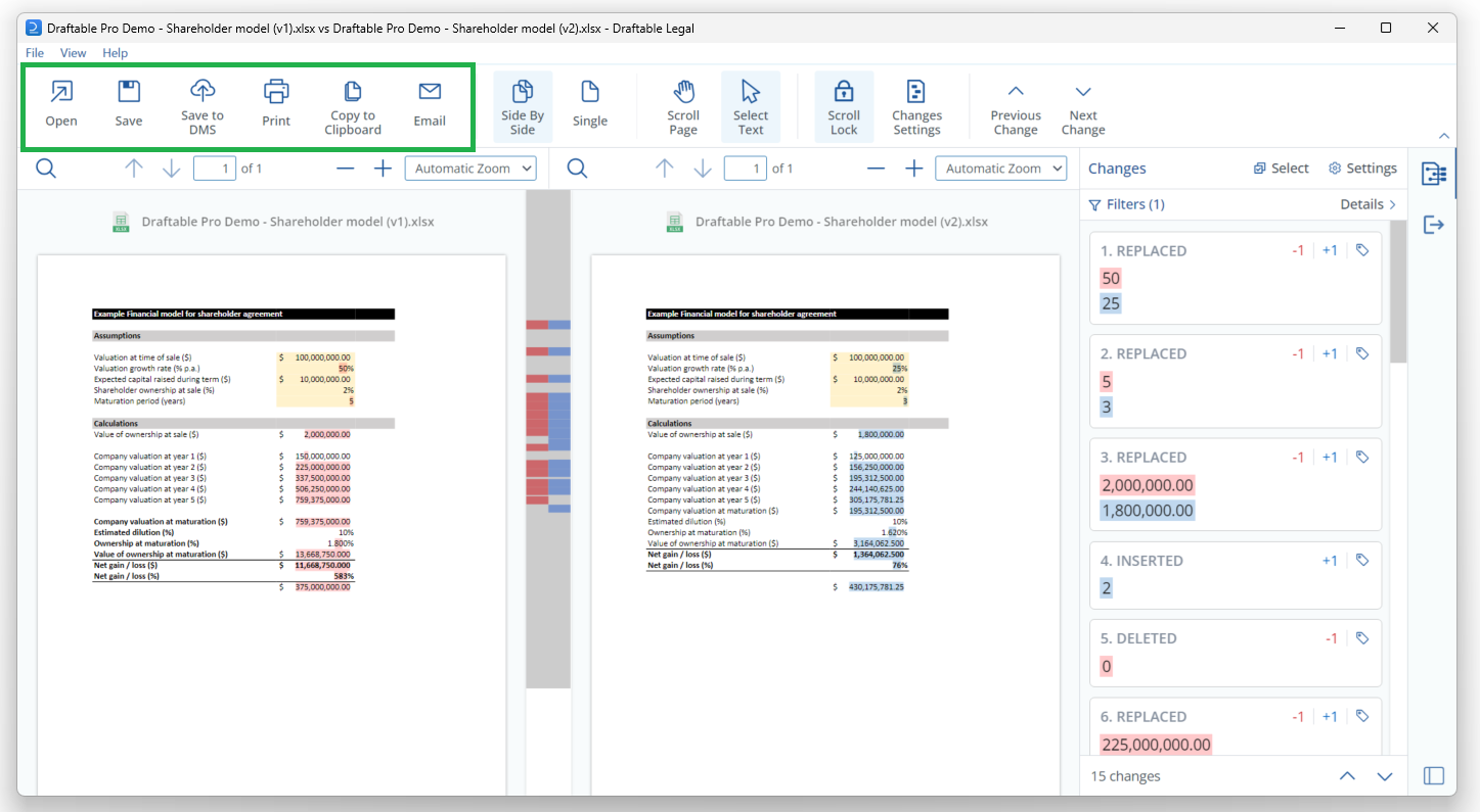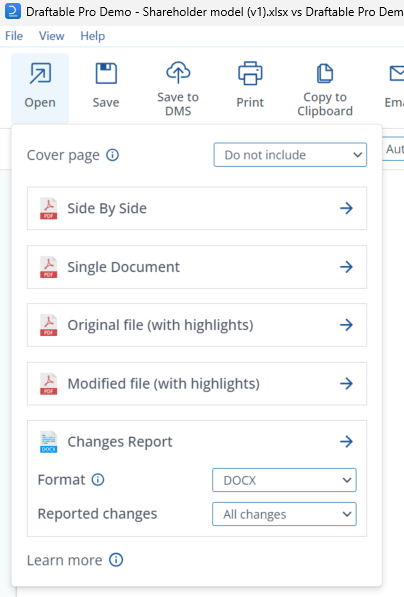 Once all review of changes is completed, users can share the comparison along with any Tags and Notes with colleagues or external parties via the many different output options shown in the ribbon menu.
