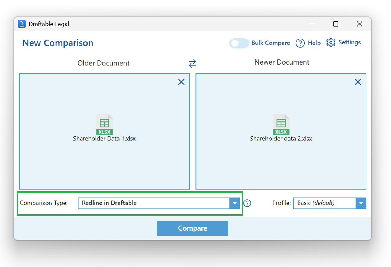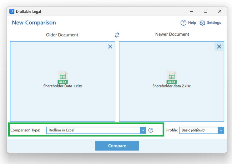 Once the documents are selected, tick the box for Redline in Excel in the comparison type row.