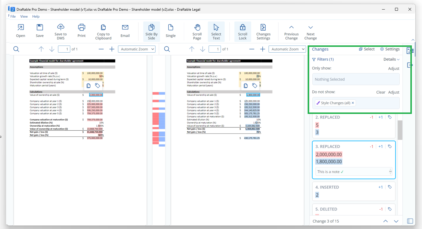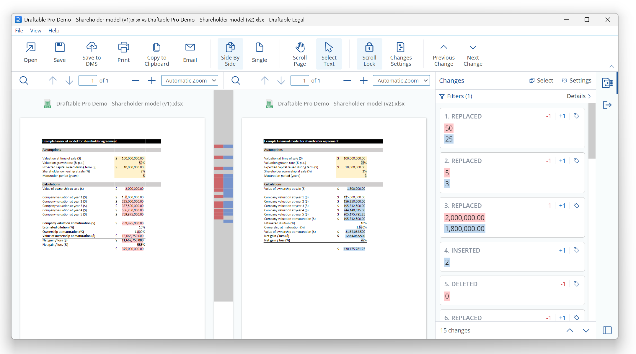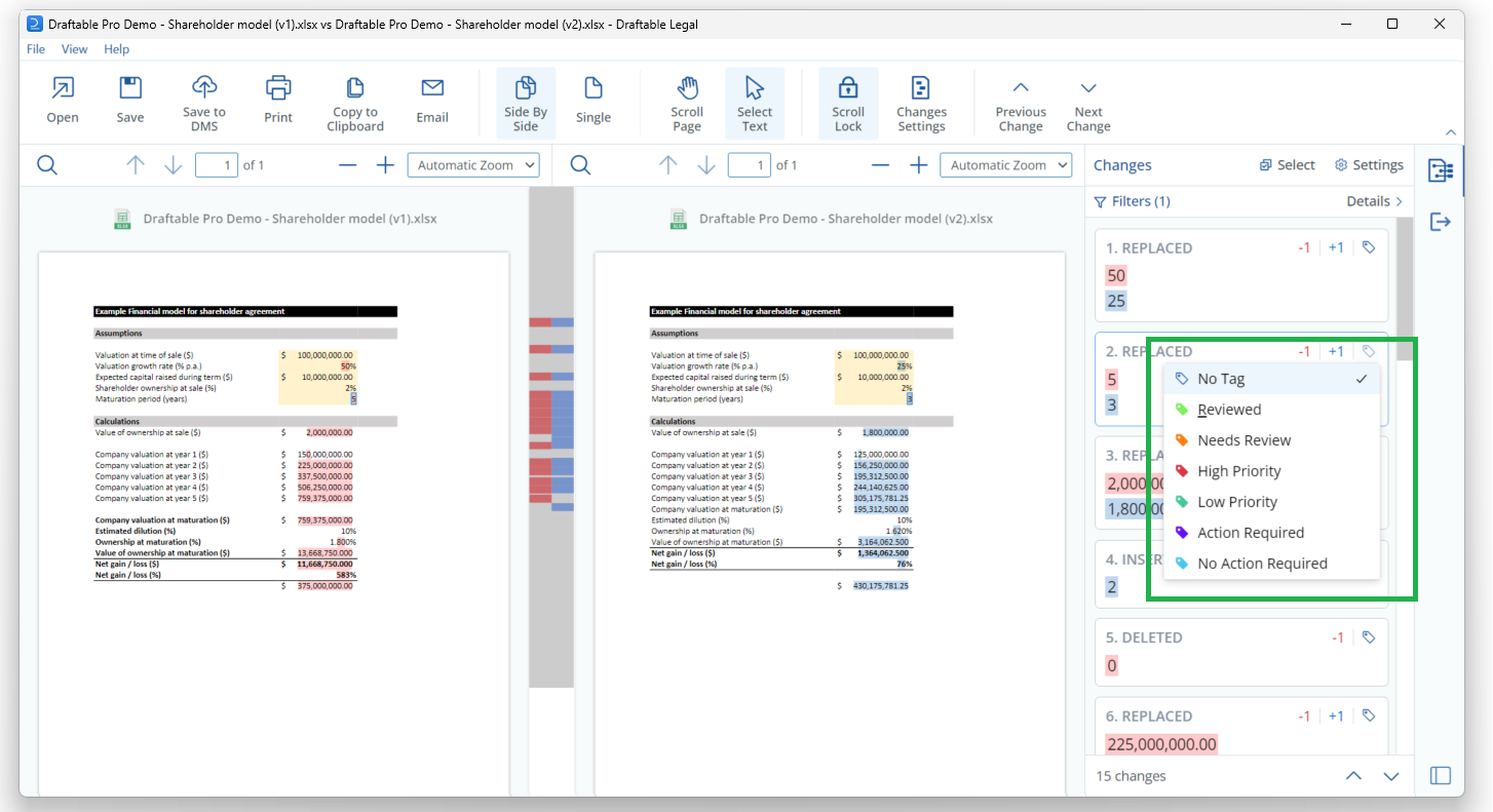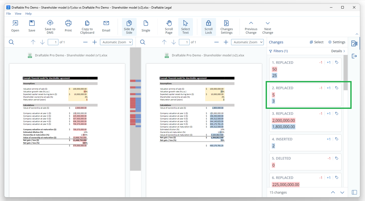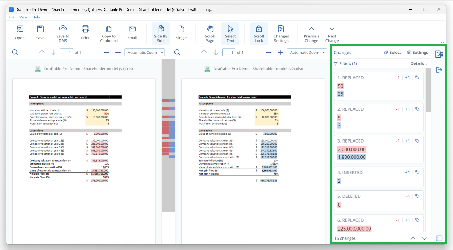 Comparing Excel files in the Redline Comparison Type in Draftable
