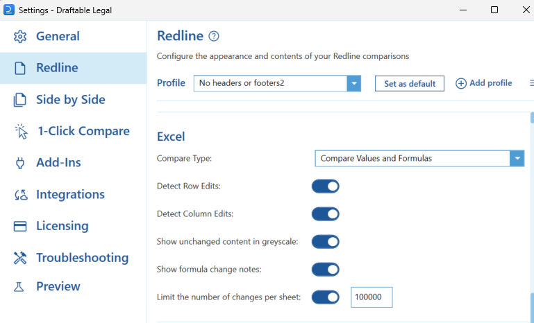 Settings for the Excel Redline comparisons can be found within the Redline tab of the settings menu. There are many options specific to Redline comparisons.