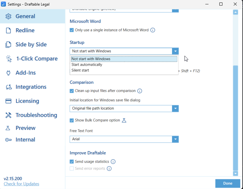 - Start with Windows: This starts Draftable Legal when Windows launches. The New Comparison Window will be shown on the main desktop after Windows has started.