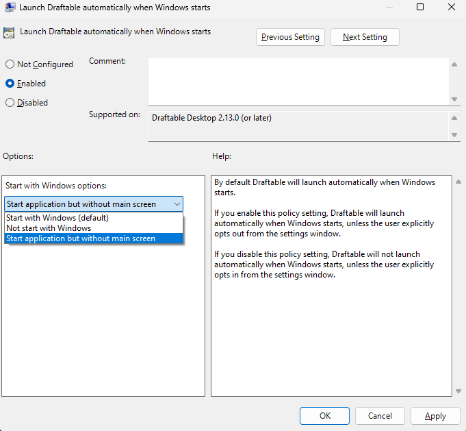 You can configure the default behaviour for the Draftable Legal start option via Group Policy options, specifically the ‘Launch Draftable Automatically when Windows Start’ option.