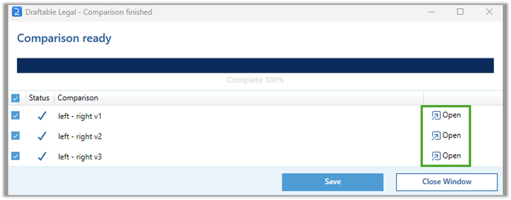 From the Comparison finished window click Open on the desired comparison output to review it in the comparison viewer. Redline .pdf comparisons and Side by Side comparisons will open in the Draftable viewer and Redline (Word with Tracked Changes) will open in MS Word.