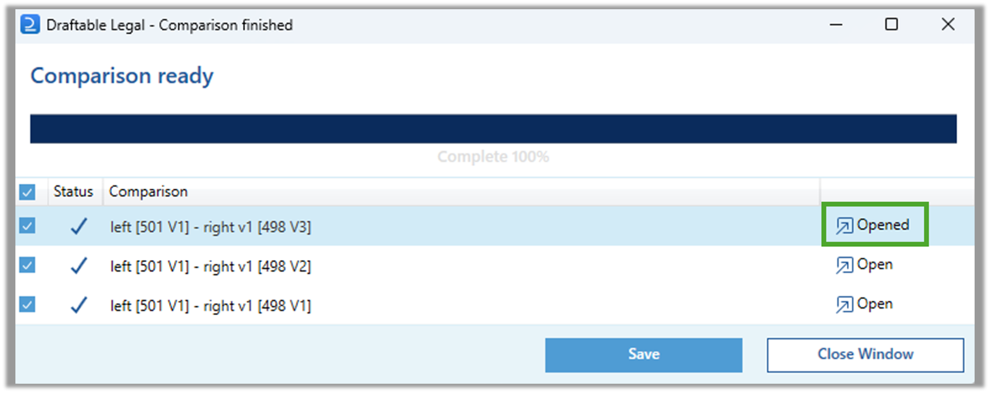 After a comparison has been opened, its status will appear in the Comparison finished window will change to **Opened.