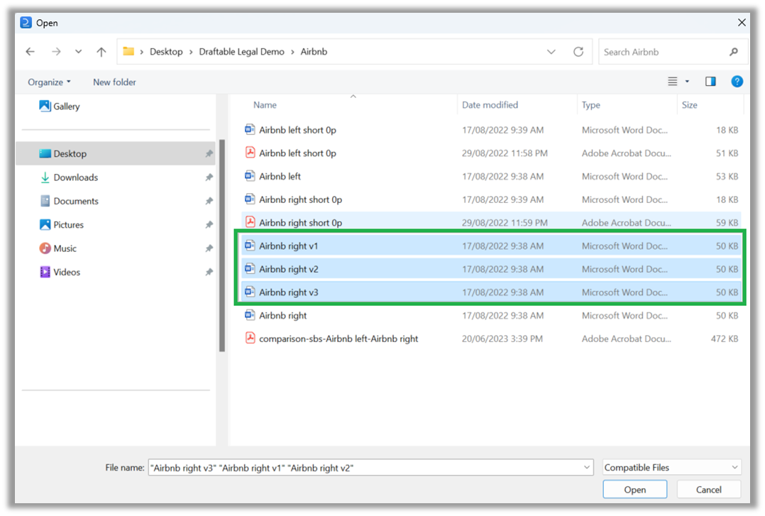 Draftable will open the windows file explorer menu, where you can select all documents required for bulk comparison and hit Open to add to Draftable. *Note, you are able to select multiple files at once by holding ‘Ctrl’ and clicking each individual file or by holding the ‘Shift’ key and selecting the first and last files in the desired list.