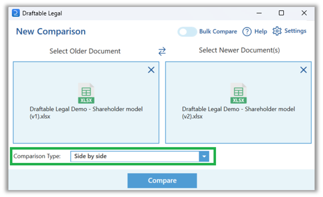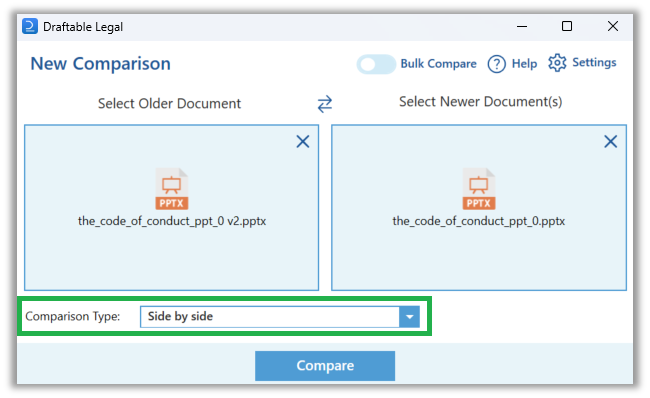 | Side by side | Our original comparison product for users that need to see changes but don’t need to continue working on a file. This produces a side by side PDF with changes shown with highlighting. Comparisons opens in the Draftable Viewer for advanced review features. Can open in Adobe, save to DMS, print, email or copy the output to clipboard. This option compares all files types (including PowerPoint and Excel). |