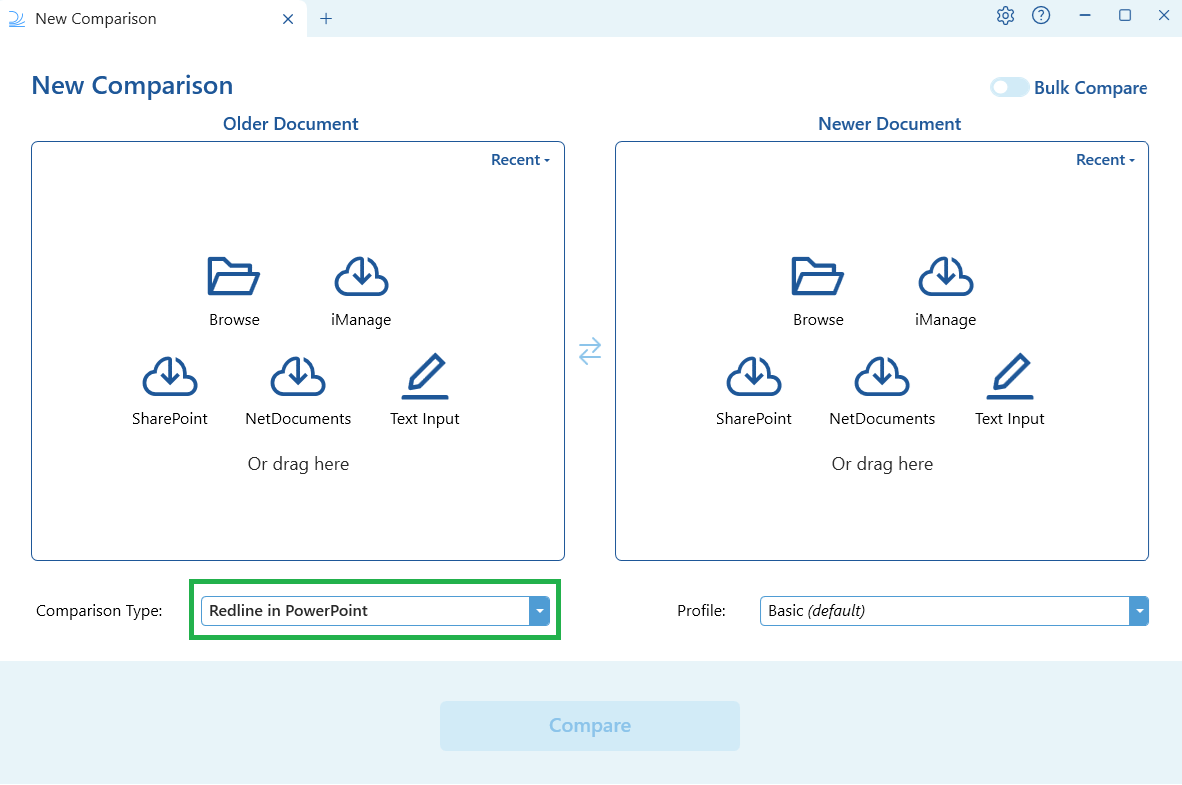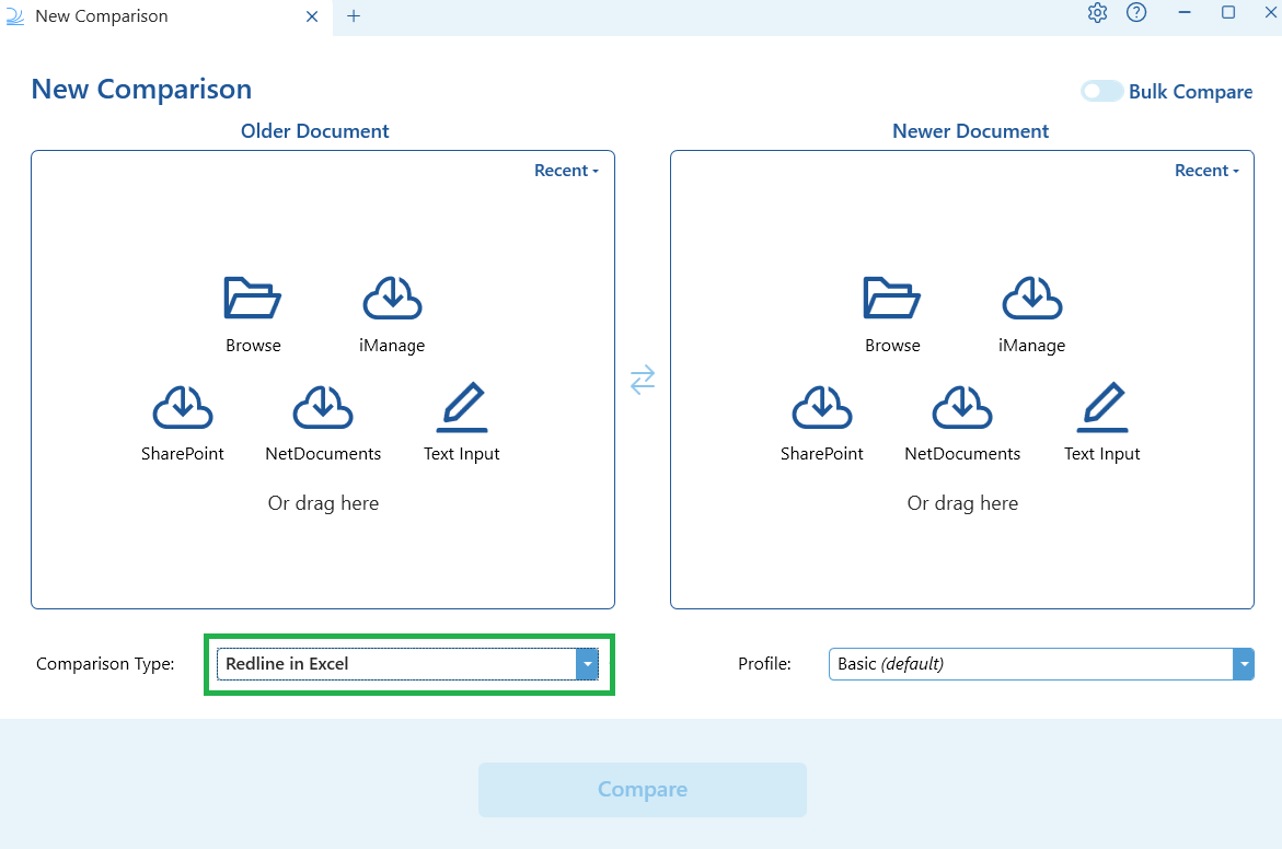 | Redline in Excel / Redline in PowerPoint | Microsoft Office’s native compare functions for PowerPoint and Excel files (Spreadsheet Compare). This is recommended for users who need to compare PowerPoint and Excel files and continue working on those files afterwards. |
