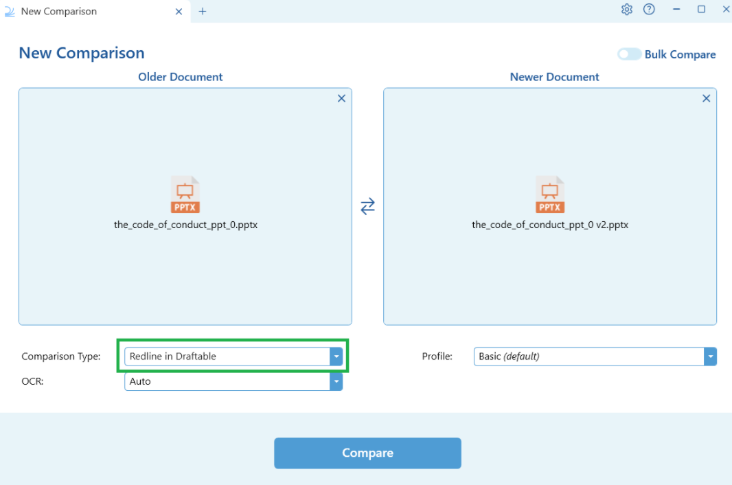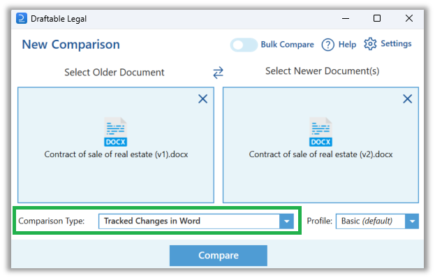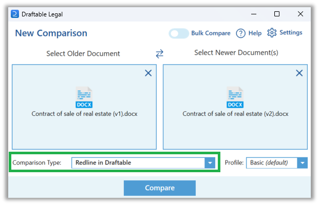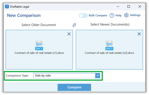 There are 5 Comparison Types in Draftable Legal. These are summarized in the table below and described in more detail in the following sections of this guide.| Comparison Type | Description |