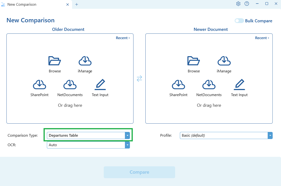 By default, Draftable will auto-select the following comparison types based on the input file loaded (see table below). Once a user selects a Comparison Type, Draftable will ‘remember’ the choice and keep that selection until it is changed again by the user.| Input file type | Default Comparison Type |