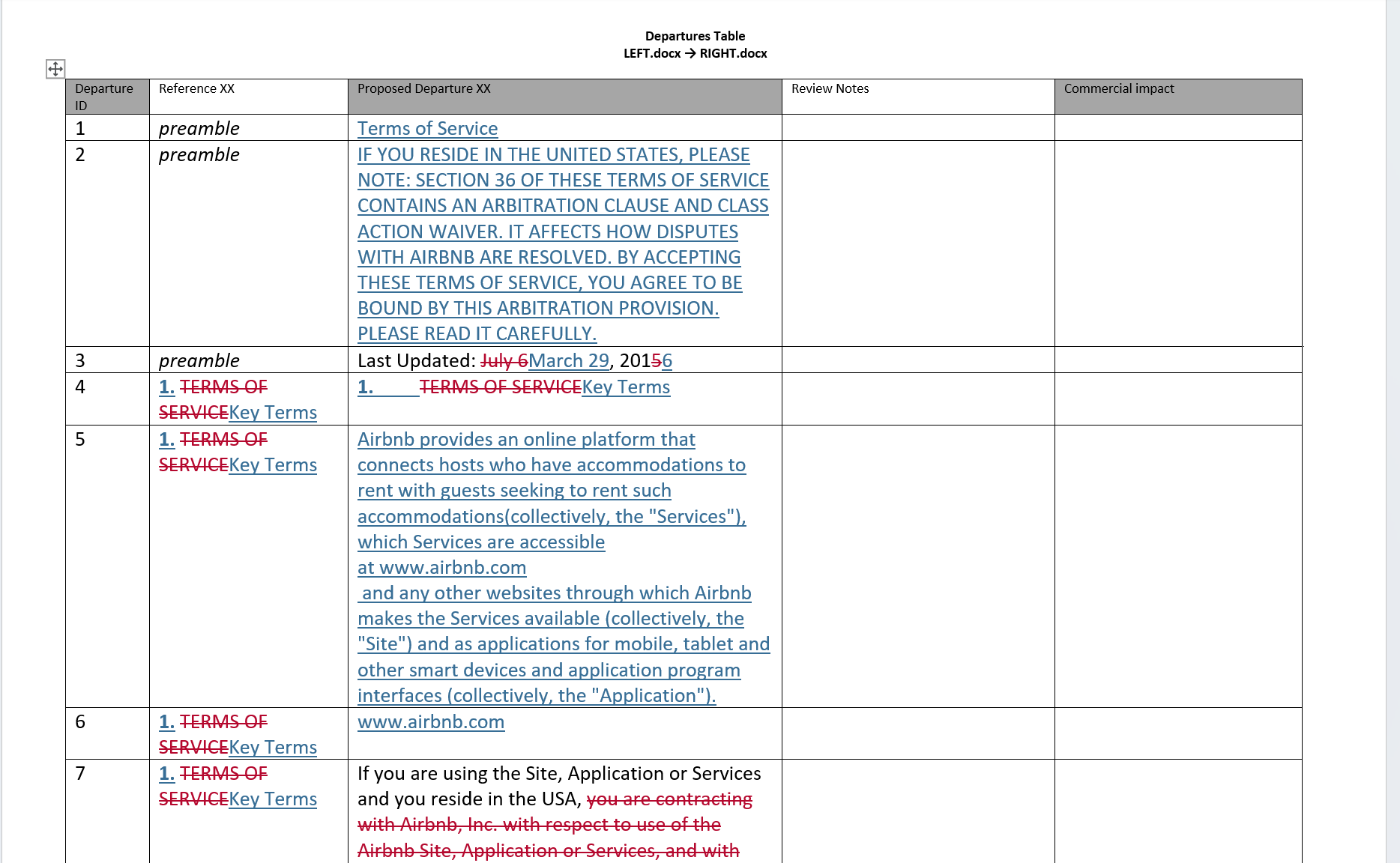 The Departures Table is a specialised report that helps you see how a document has changed with full context. Instead of just showing edits inline or as redlines, it highlights the entire section or clause where a change occurred.