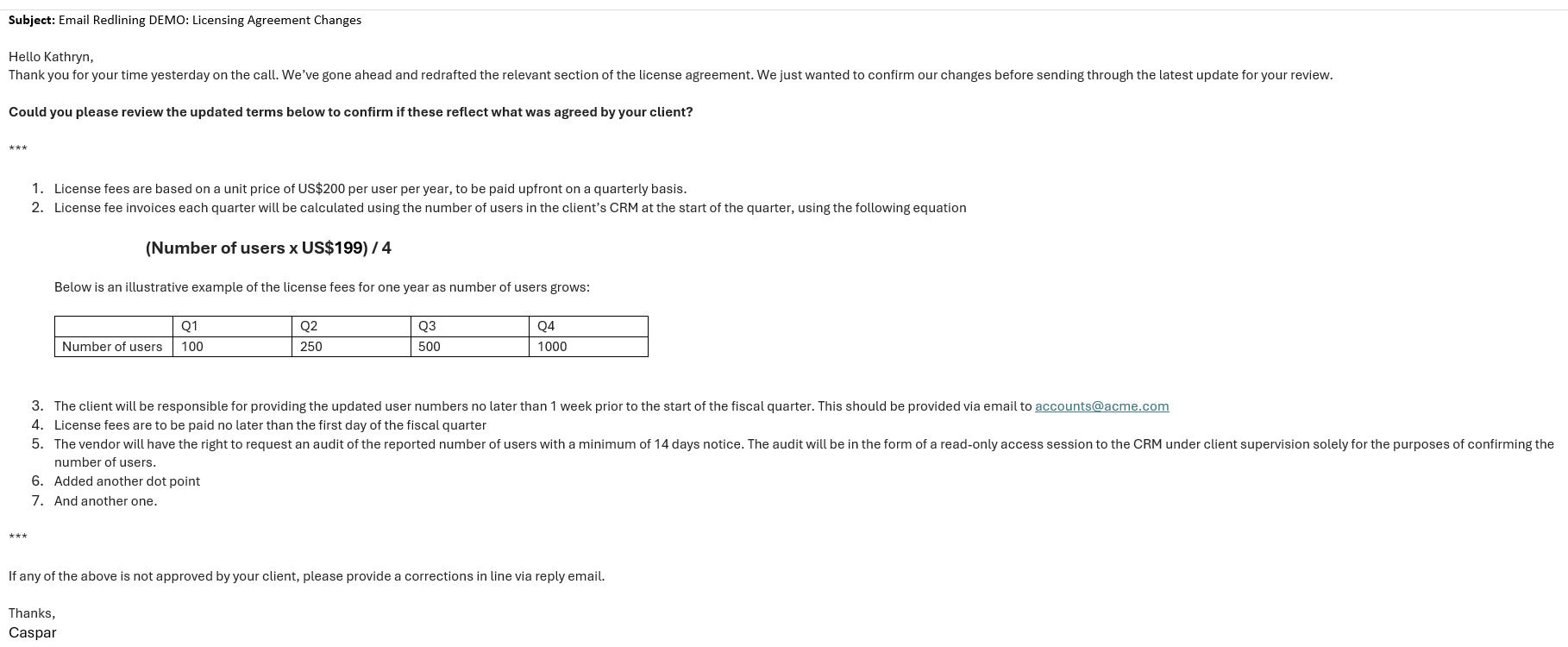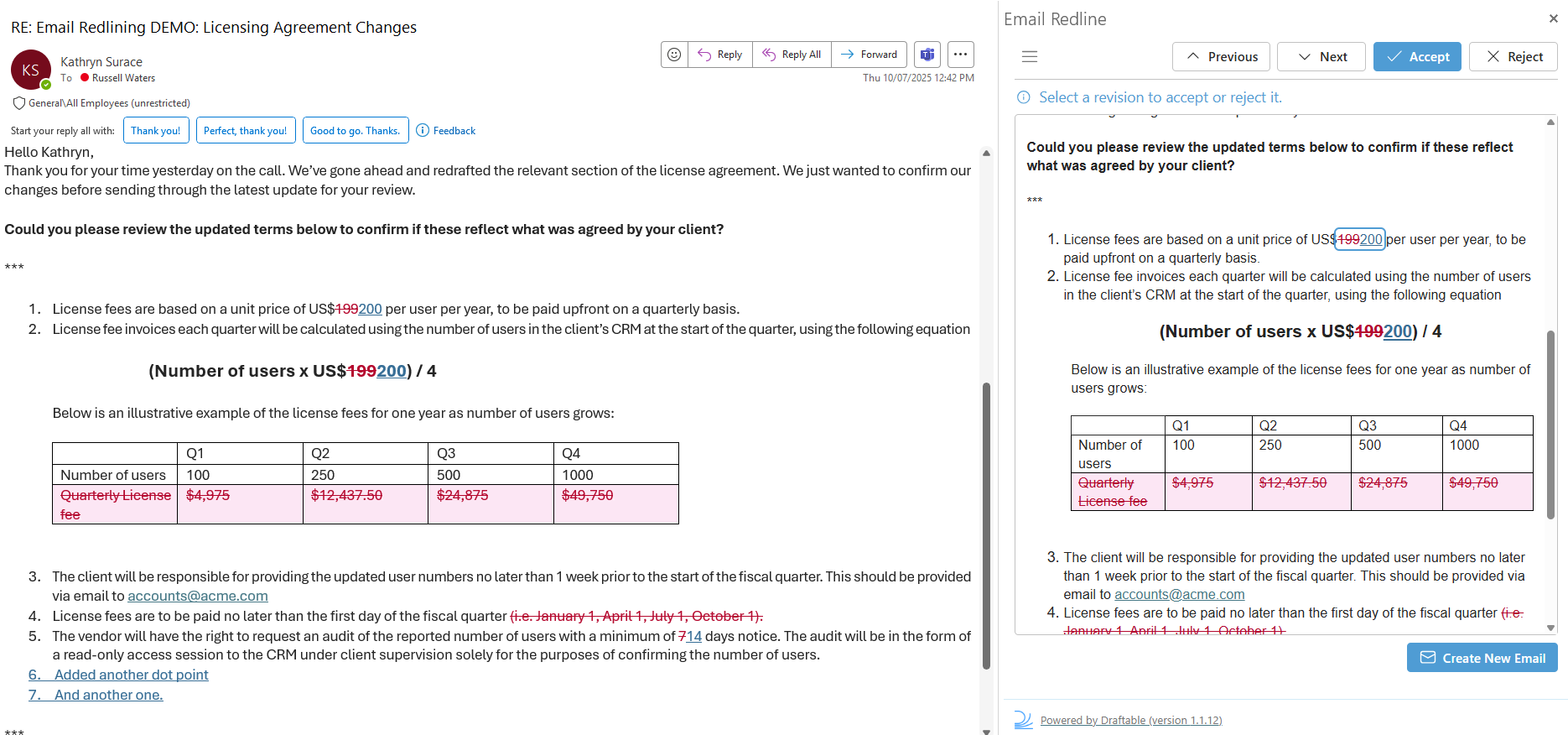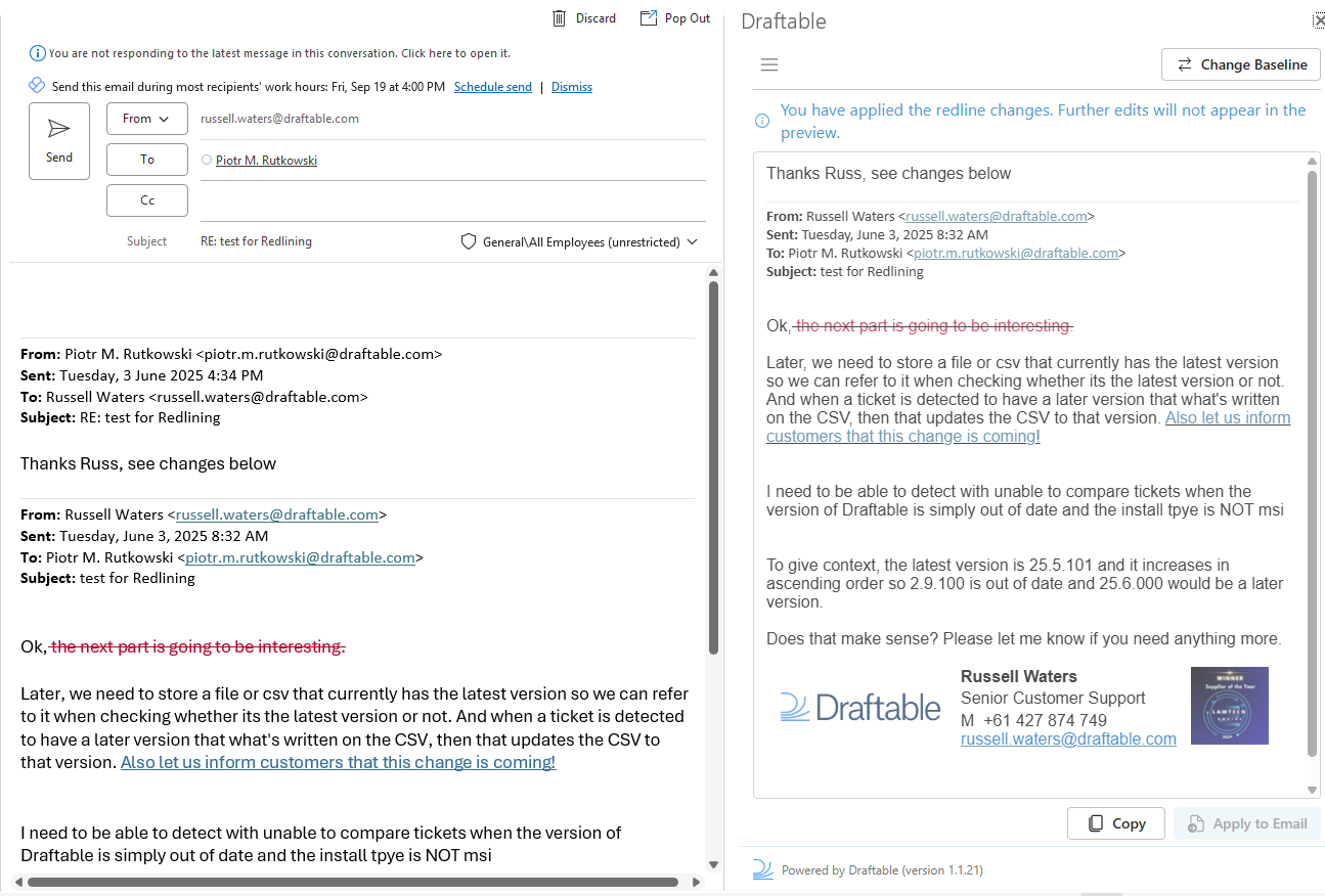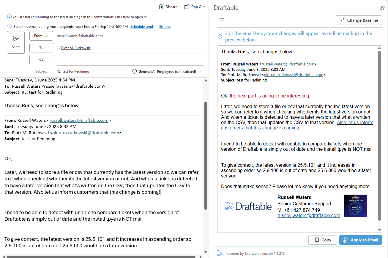 As you make changes in the email editor, these will automatically appear in the Email Redline preview window. Once you are satisfied with your changes, select “Apply to Email” on the bottom right side of the Email Redline window. Your changes will apply as below to your email draft as redline: