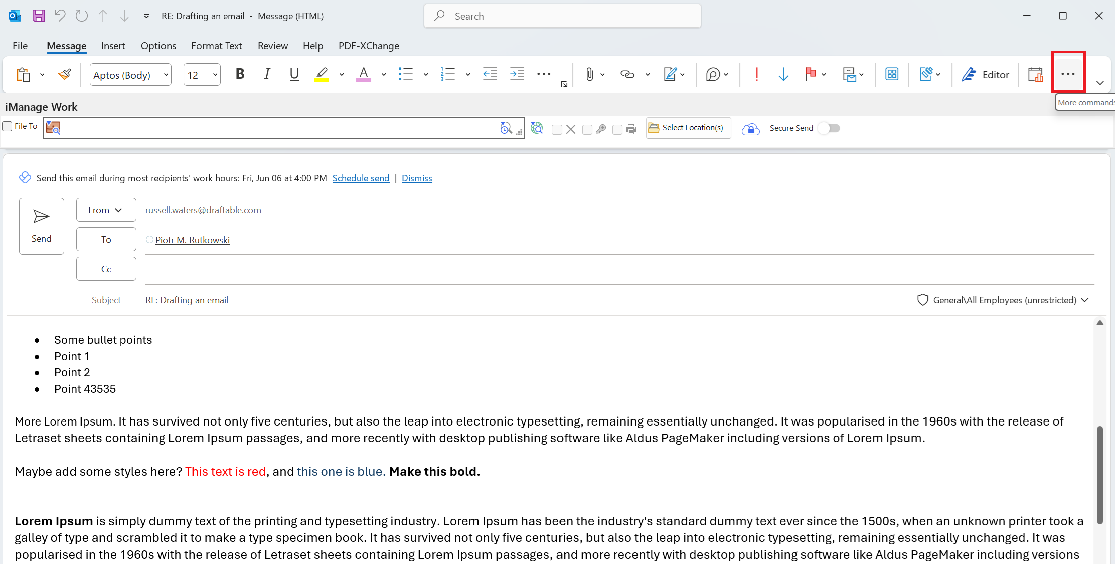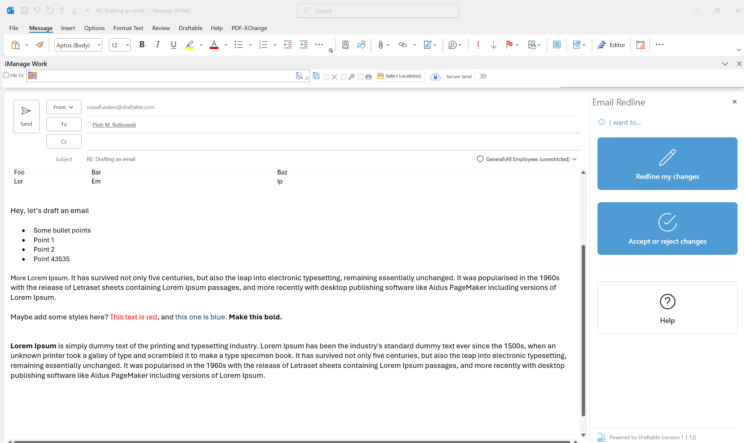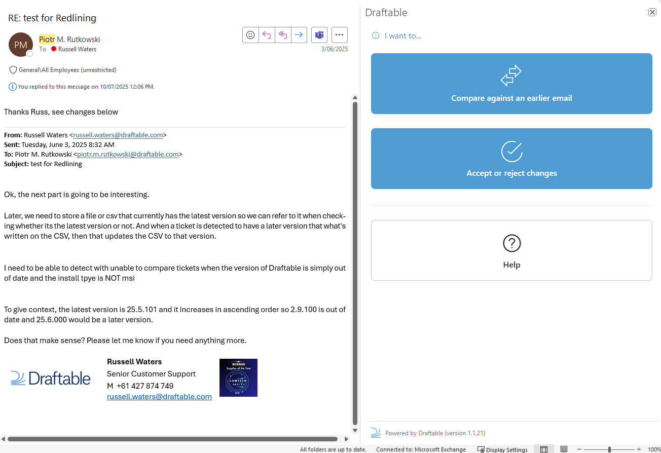 Note:Please ensure that Draftable Legal is running and open in the background; otherwise, Redline in Email will not correctly operate in Outlook.