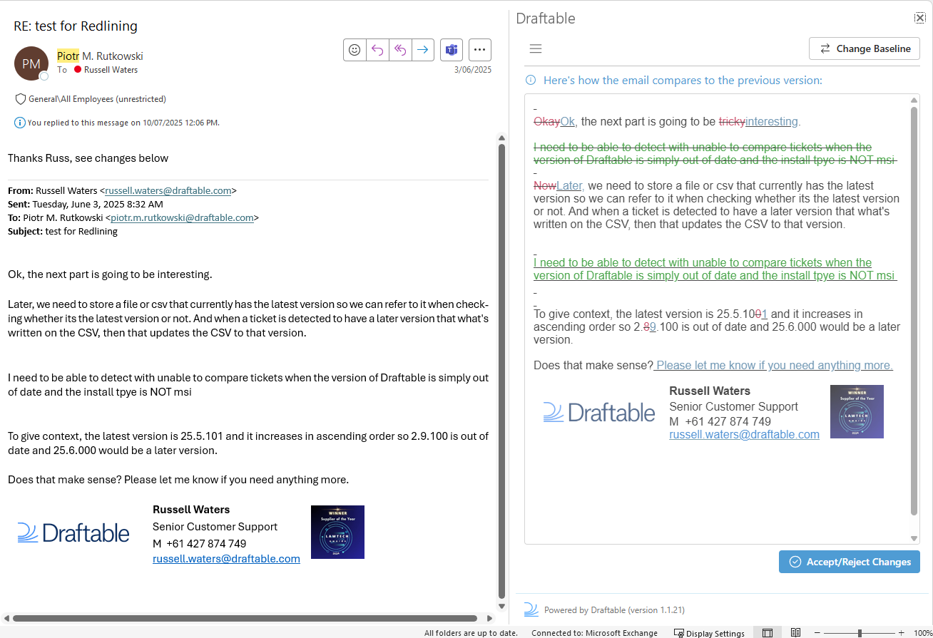 This window shows all the redlined changes that have been marked up by the sender of this email when they previously redlined the changes in their last email.