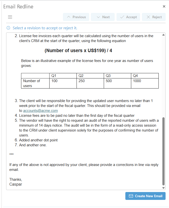 Continue accepting and rejecting changes until you are done, and then you are ready to reply, hit the Create New Email to create a new email with the accepted and rejected changes.