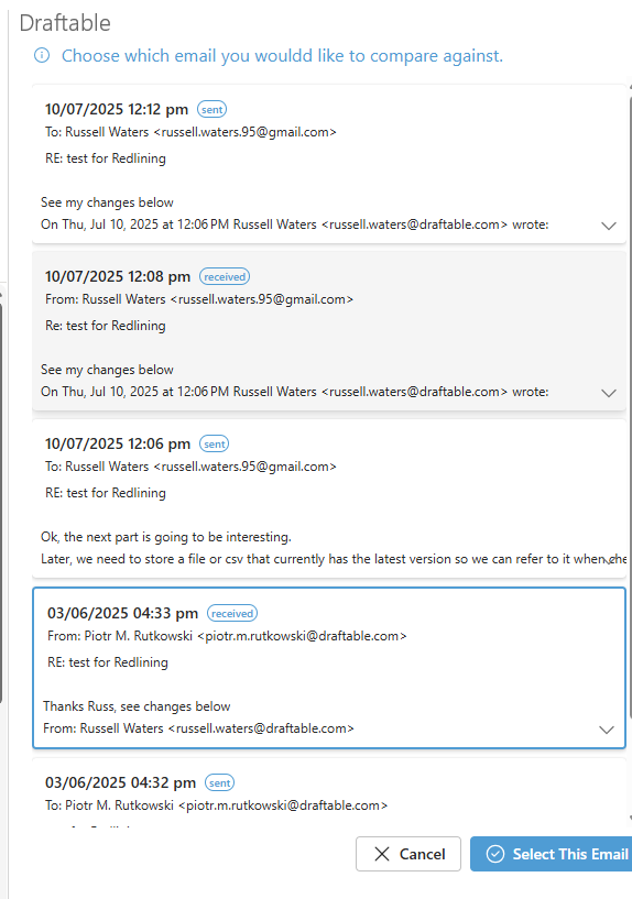 Once selected, the following window will appear. This window shows all the redlined changes that have been marked up by the sender of this email when they previously redlined the changes in their last email.