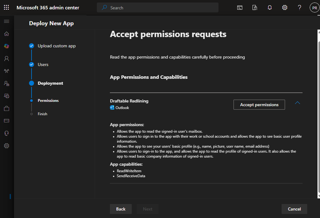 Once permissions are approved and the app is assigned to your selected users, the Draftable Redline Add-in will be available within Outlook. It will appear in the ribbon when composing emails.Please note: The Application installation and update can take up to 72 hours (and in some cases longer).. For more information about it, please visit Microsoft Documentation - Deploy add-ins in the admin center - Microsoft 365 admin | Microsoft Learn